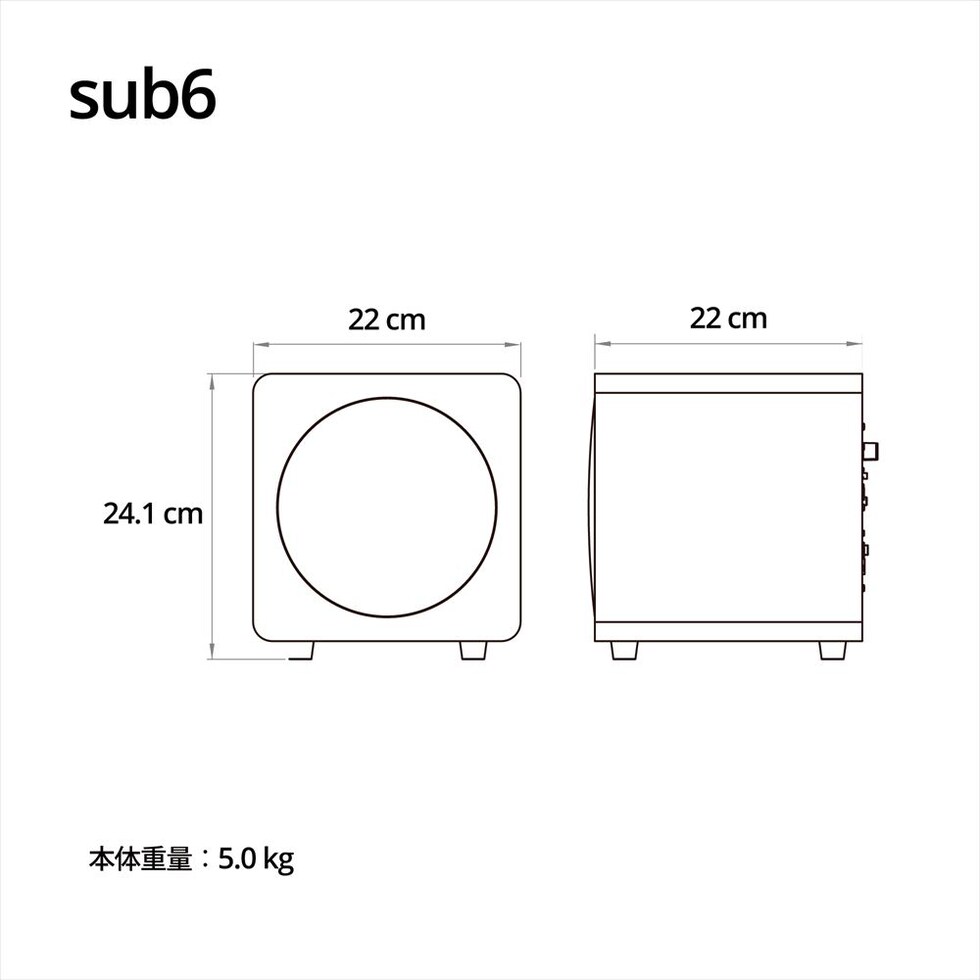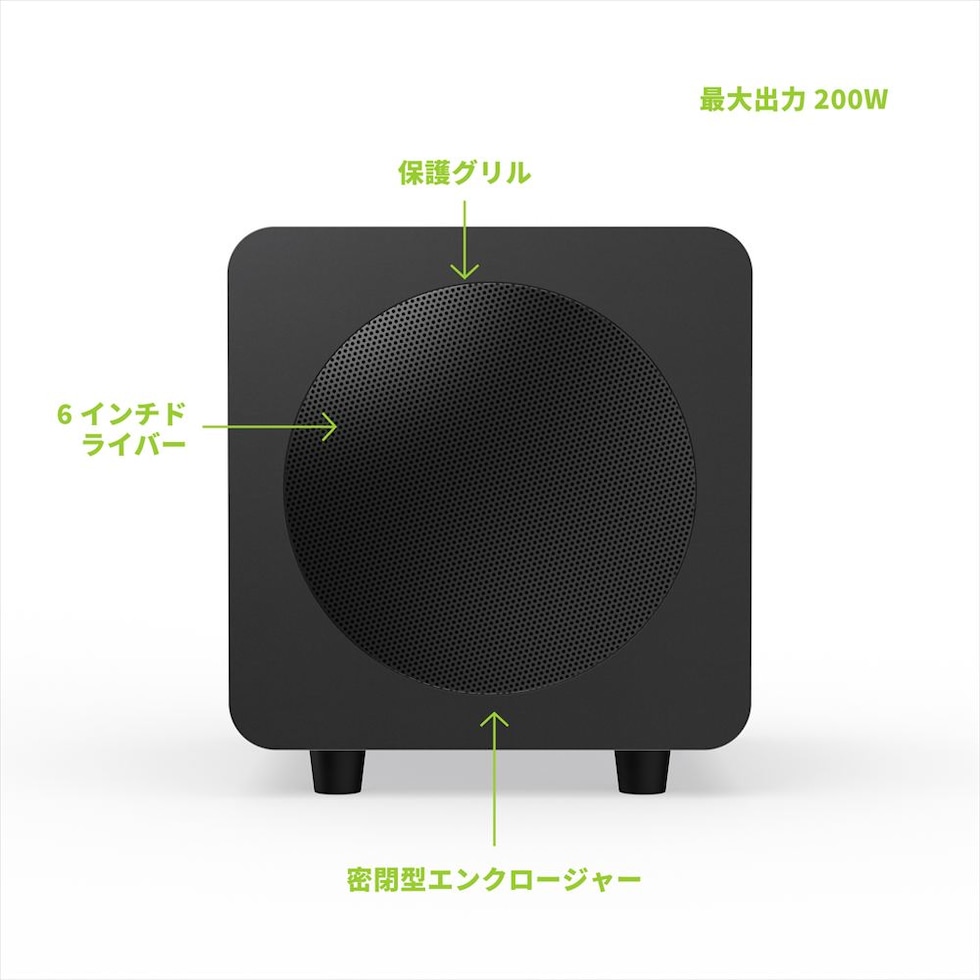 Sub6は、音楽・映画・ゲームに深みと明瞭さを加える正確な低音を再生します。200Wアンプと6インチウーファーを搭載し、豊かでコントロールされた低域を実現。自然なバランスで低音を補強します。