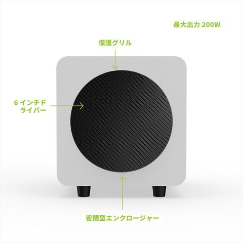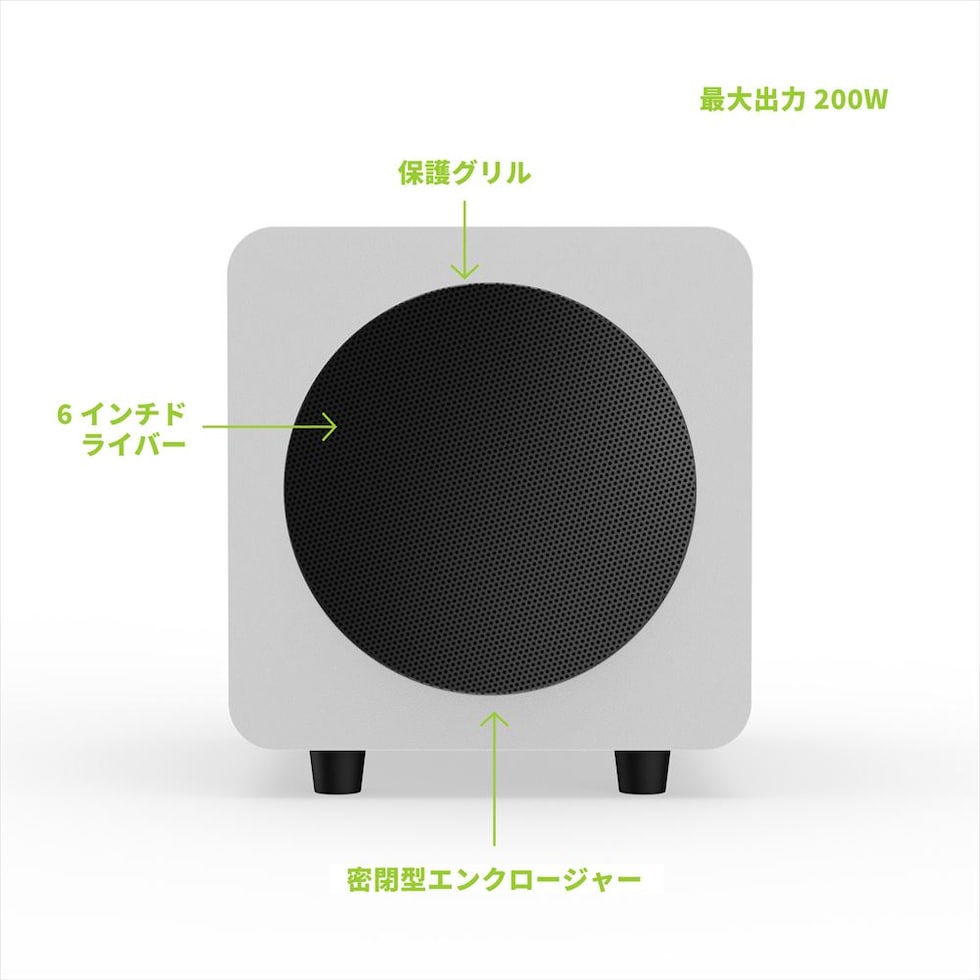 Sub6は、音楽・映画・ゲームに深みと明瞭さを加える正確な低音を再生します。200Wアンプと6インチウーファーを搭載し、豊かでコントロールされた低域を実現。自然なバランスで低音を補強します。