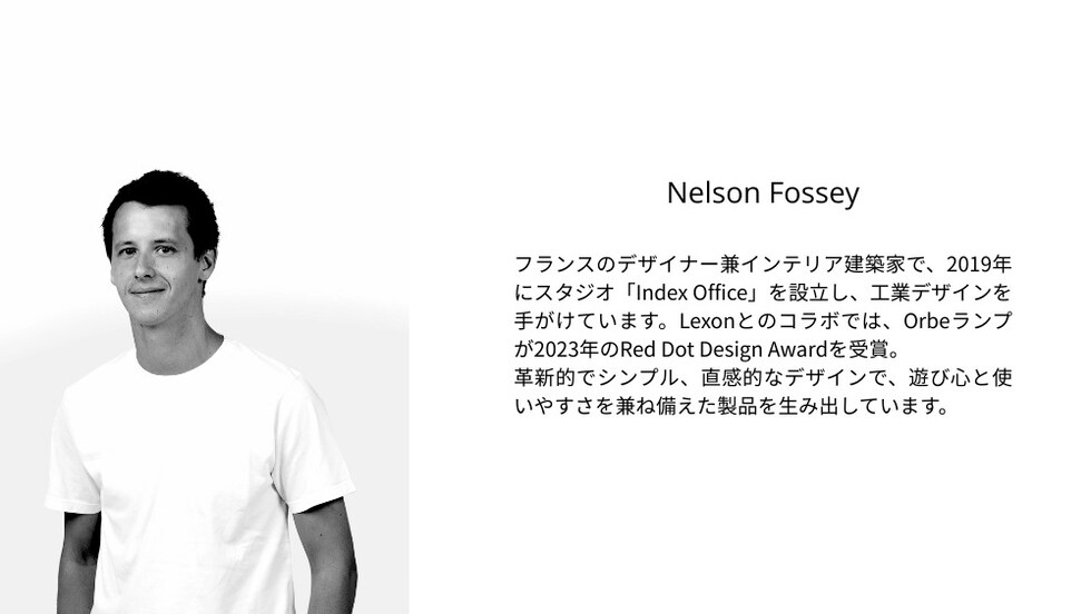 フランスのデザイナー兼インテリア建築家で、2019年にスタジオ「Index Office」を設立し、工業デザインを手がけています。Lexonとのコラボでは、Orbeランプが2023年のRed Dot Design Awardを受賞。革新的でシンプル、直感的なデザインで、遊び心と使いやすさを兼ね備えた製品を生み出しています。