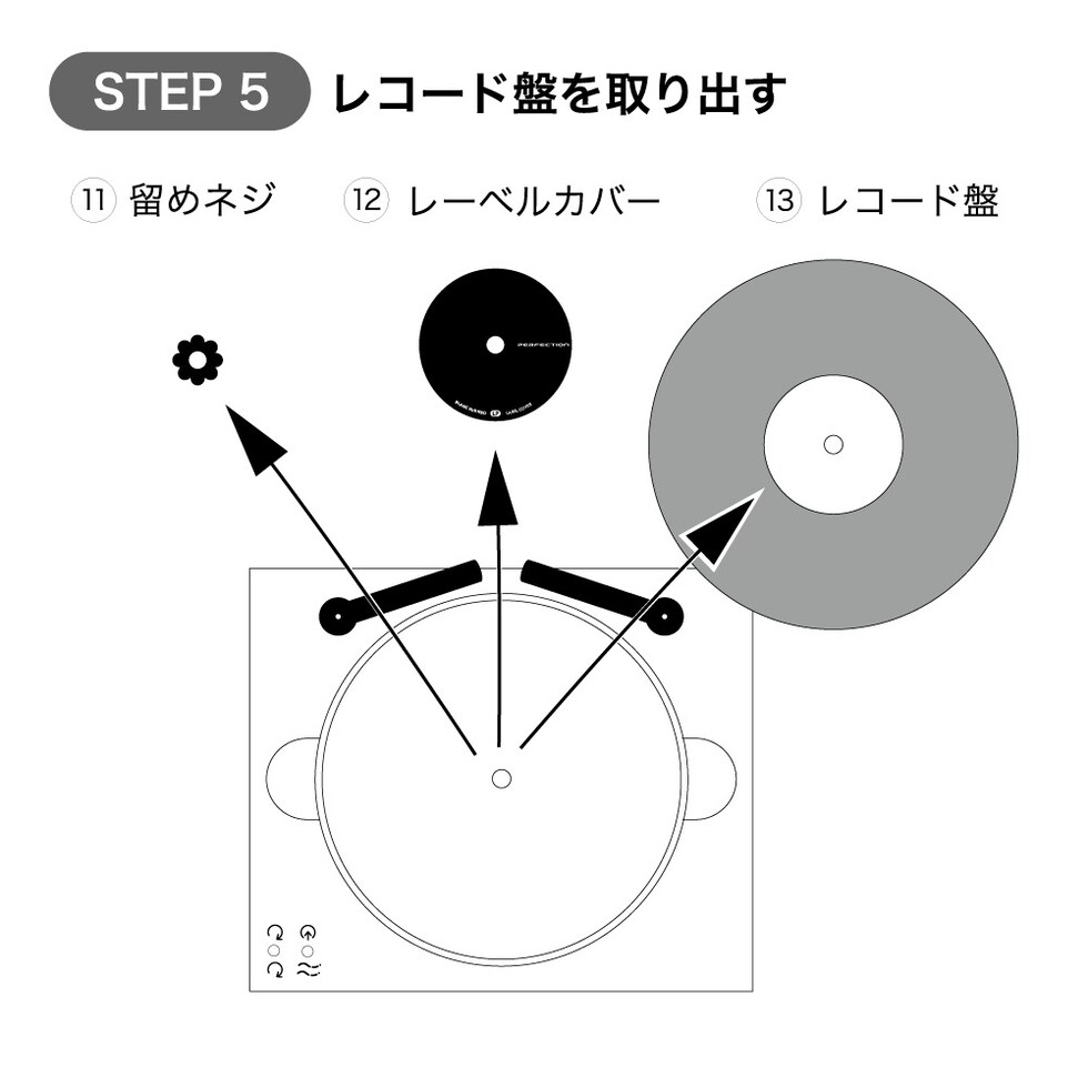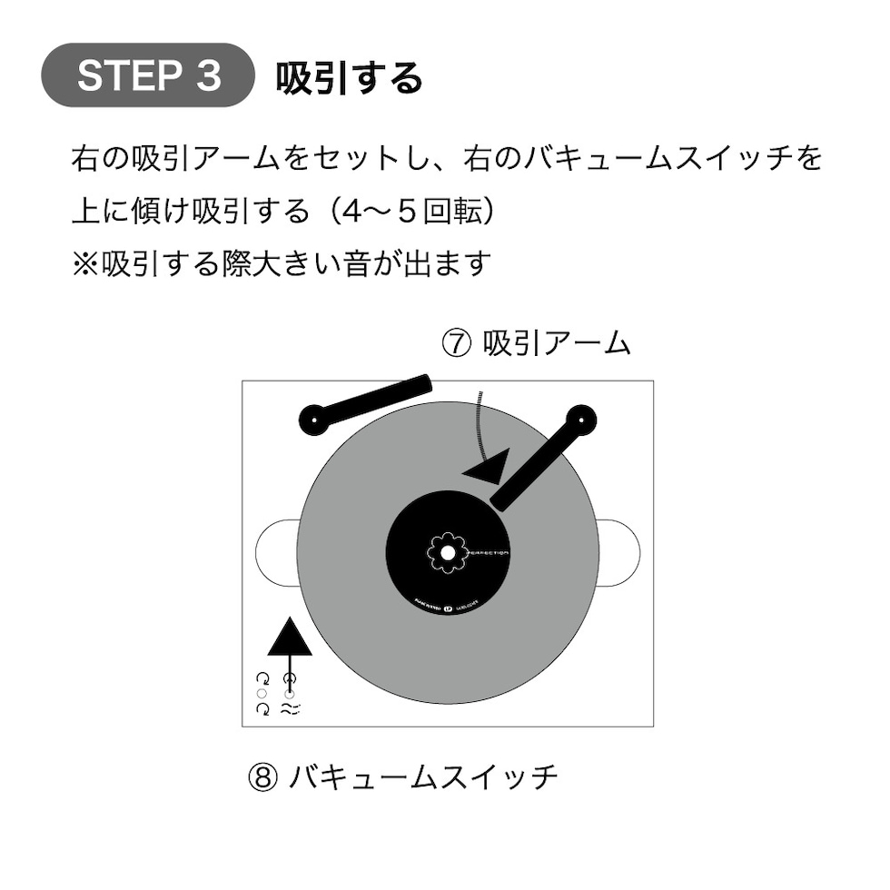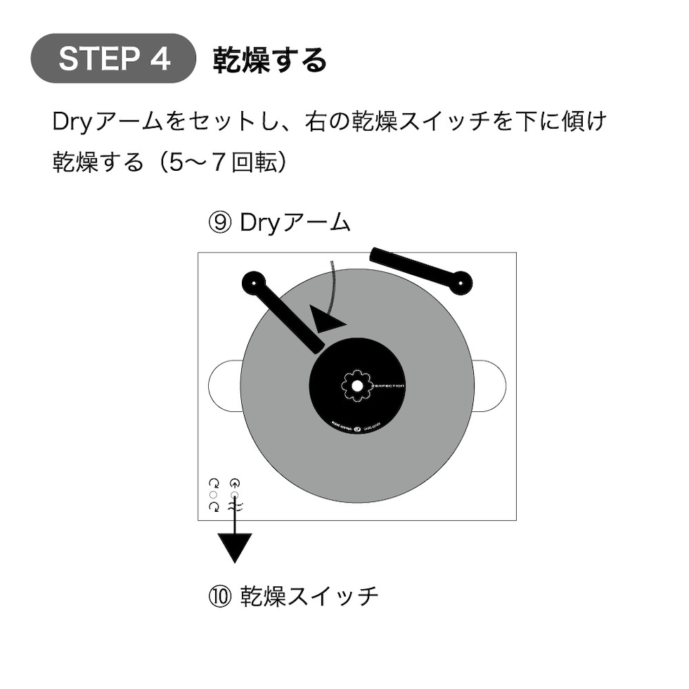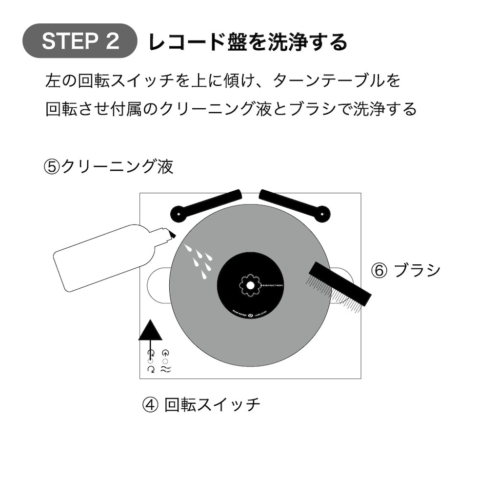 本製品最大の特徴は半自動で行えるバキュームクリーニング機能です。レコード盤を本機に設置した後、付属の洗浄液とブラシを使って手動で盤を洗浄。特に汚れやカビのひどい場合はしっかりとブラッシングしてください。洗浄後は吸引を行い、乾燥まで行えます。バキューム時は大きな音が出ますが、それは吸引力に直結しており、レコード盤に付いた洗浄液を掻き出した汚れごと強力に吸引します。乾燥アームで乾燥させた後、すぐにレコードプレーヤーに設置し再生することが可能です。