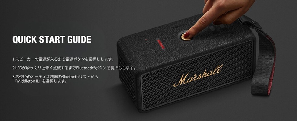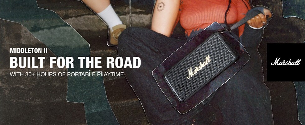 2023年に発売され、Marshallブランドの代表的なポータブルスピーカーとなった「Middleton」に、さらなる改良が加えられ、よりアウトドア環境に適したスピーカーとして新登場となった「Middleton II」。従来の1.5倍に相当する最大30時間のポータブル再生時間が可能になり、丸1日バッテリー切れの心配なく使えるように進化しました。また、バッテリーが不足した場合でも、たった20分の充電で再び再生が可能になります。そして従来モデル同様、Marshall独自の「True Stereophonic」全方位サウンドも装備しているため、ユーザーがどこにいても包み込まれるようなサウンドを体感できます。深い低音もクリアな高音も、立体的なサウンド体験を提供します。