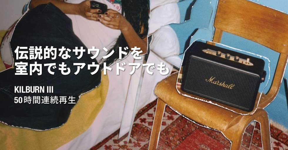 ポータブルなスピーカーでありながら、パワフルかつ高品質なサウンドで有名なポータブルスピーカーシリーズ「Kilburn」。従来の「Kilburn II」モデルでは、最大で20時間の音楽再生が可能であった中、今回の「Kilburn III」ではその倍以上となる50時間の再生時間が実現しました。他にも「Kilburn III」では、Marshall独自のマルチディレクショナル(全方位)サウンドの採用により、どこから聞いても迫力のあるサウンドが360度体感できたり、低音から高音までどんな音量でもバランスとれた音で再生できるなど、あらゆる面でMarshallのこだわりが実現されています。またデザイン面においても細部までの工夫が施されており、自社のアンプやロックンロールの歴史にインスパイアされたクラシックな外観を踏襲しています。ベルベット縁のストラップやロータリーノブなどは、どのような場面にもきれいにフィットする定番なデザインとなっています。コードや電源を気にすることなく持ち運びできるほか、IP54の防水防塵対応により屋内でも屋外でも、「Kilburn III」があればお気に入りのプレイリストをどこでも再生できます。