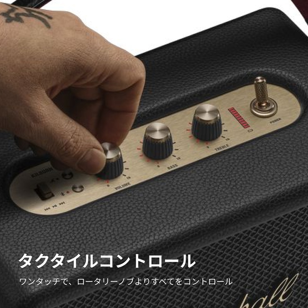 低音や高音の調整、オン/オフの設定、曲の再生/停止/スキップはすべてワンアクションでコントロールロータリーノブより可能です。Marshallの「M」ボタンを使って、即座にプリセット状態へもアクセス可能です。