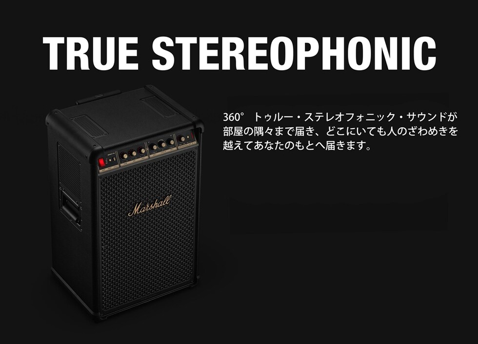 Marshall独自の「True Stereophonic」全方位サウンドにより、ユーザーがどこにいても多方向から音楽を聞くことができ、倉庫や路上から広場まで、あらゆる場所で響き渡るサウンドを楽しめます。また2つのツイーターが搭載されているため、音は頭上へと押し上げられ、より本格的な音楽体験が実現しています。どのような音量でもクリアに、ひとつひとつのビートを全身で感じられます。