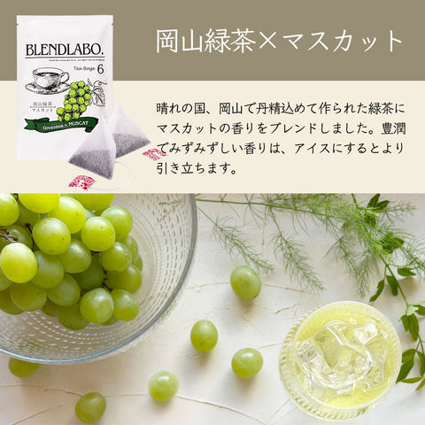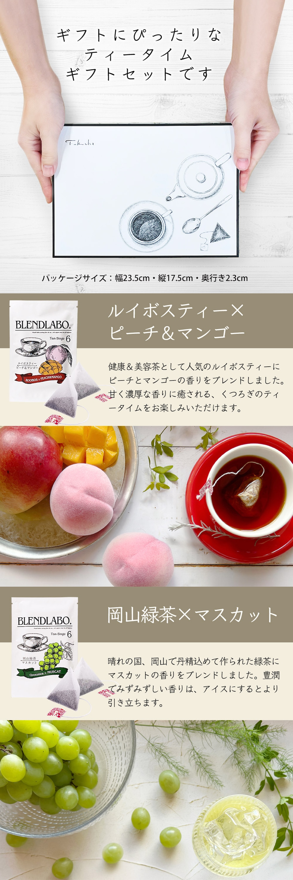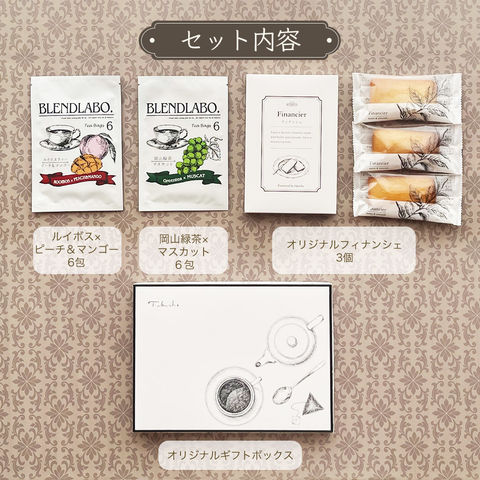ルイボスティー×ピーチ&マンゴー:15g(2.5g×6包) 岡山緑茶×マスカット:15g(2.5g×6包) フィナンシェ : 3個 |