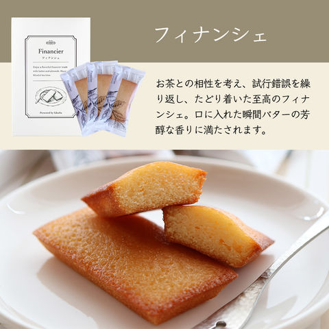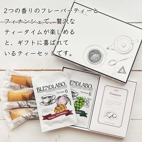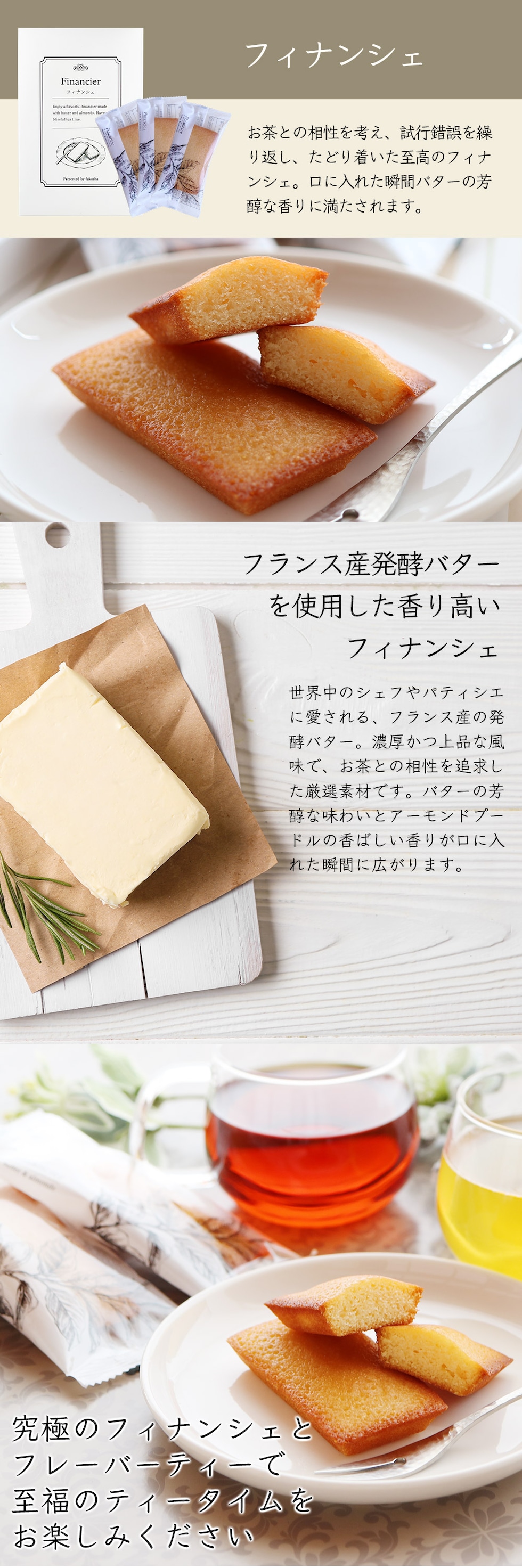 フランス産発酵バターをふんだんに使用した風味豊かなフィナンシェと、 フレーバーティー2種をセットにした、ティータイムギフトです。 誕生日や、母の日などのシーズンギフトにはもちろん、 ご自宅でのティータイムにもおすすめです。 | |