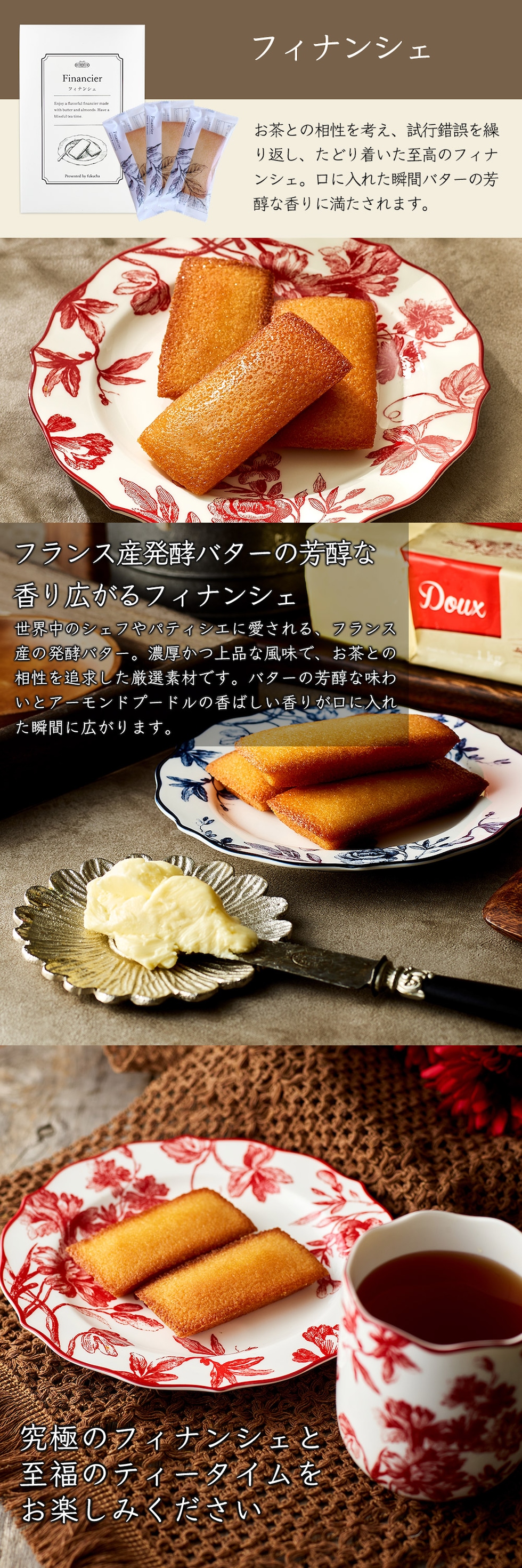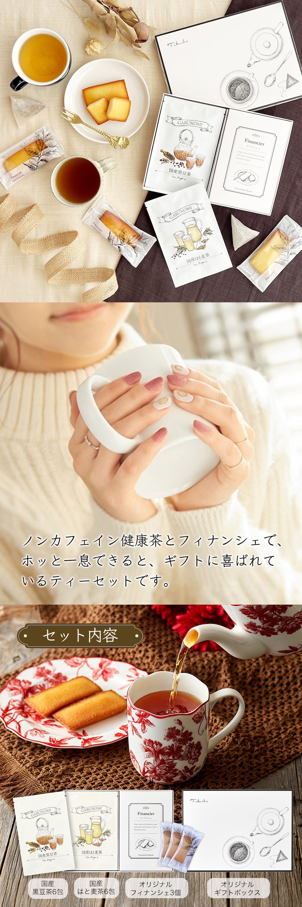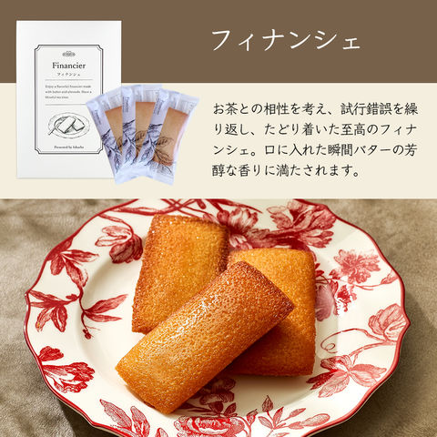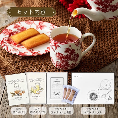 フランス産発酵バターをふんだんに使用した風味豊かなフィナンシェと、 ノンカフェイン健康茶2種をセットにした、ティータイムギフトです。 誕生日や、母の日などのシーズンギフトにはもちろん、 ご自宅でのティータイムにもおすすめです。 | |