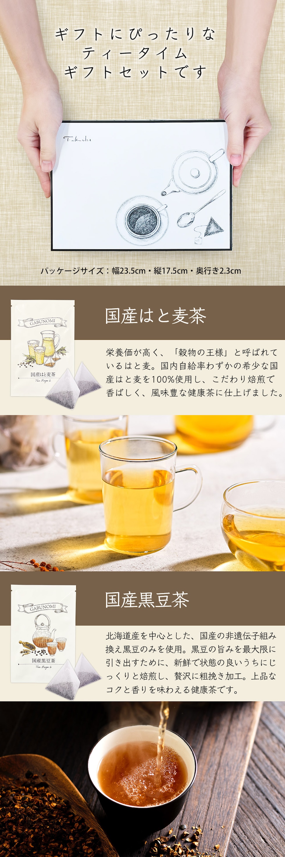 国産はと麦茶 : 15g(2.5g×6包) 国産黒豆茶 : 18g(3g×6包) フィナンシェ : 3個 |