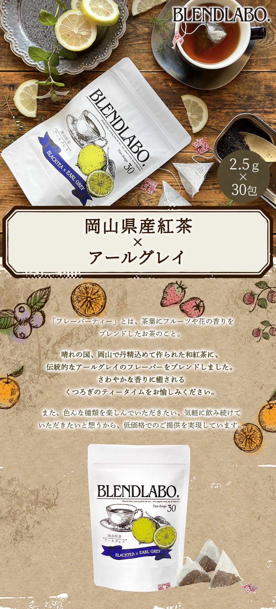 紅茶 フレーバーティー フルーツティー 国産紅茶 和紅茶 岡山県産 お茶 健康茶 美容茶 アールグレイ ベルガモット ティーバッグ ティーパック パック 30包 国産 Blend LABO. flavored tea 送料無料