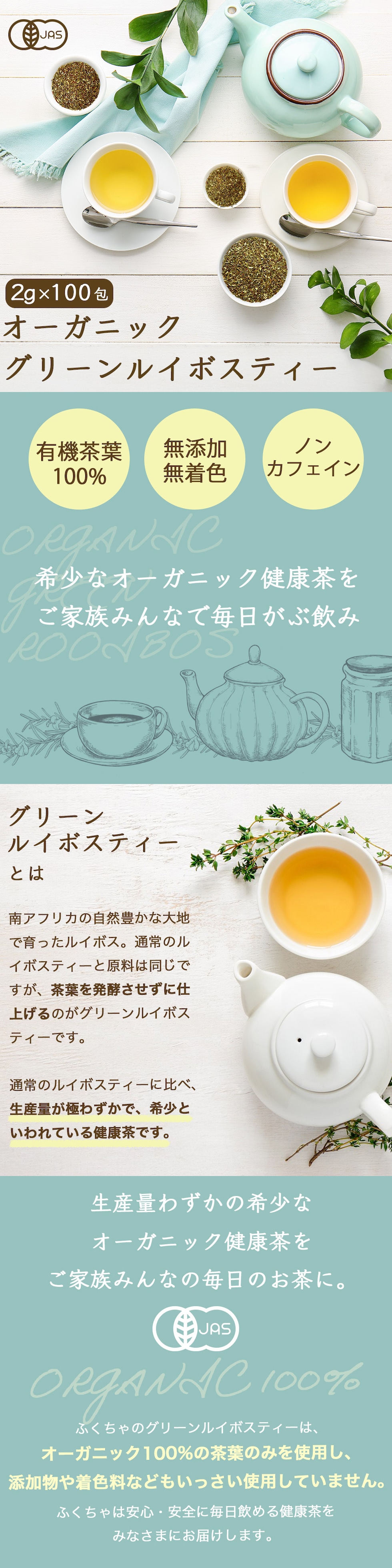 オーガニック グリーンルイボスティー 100包 植物由来 ティーバッグ 有機JAS ノンカフェイン 健康茶 美容茶 グリーン ルイボス 茶 ruibosu ハーブティー ミネラル 子育て 育児 お茶 がぶ飲み ふくちゃ