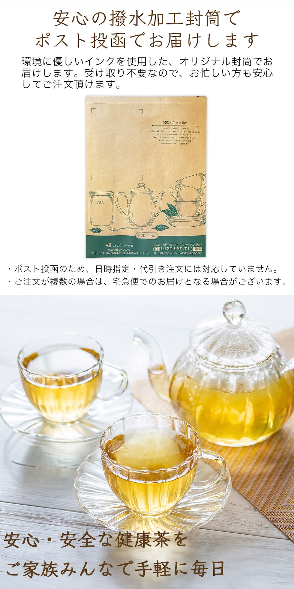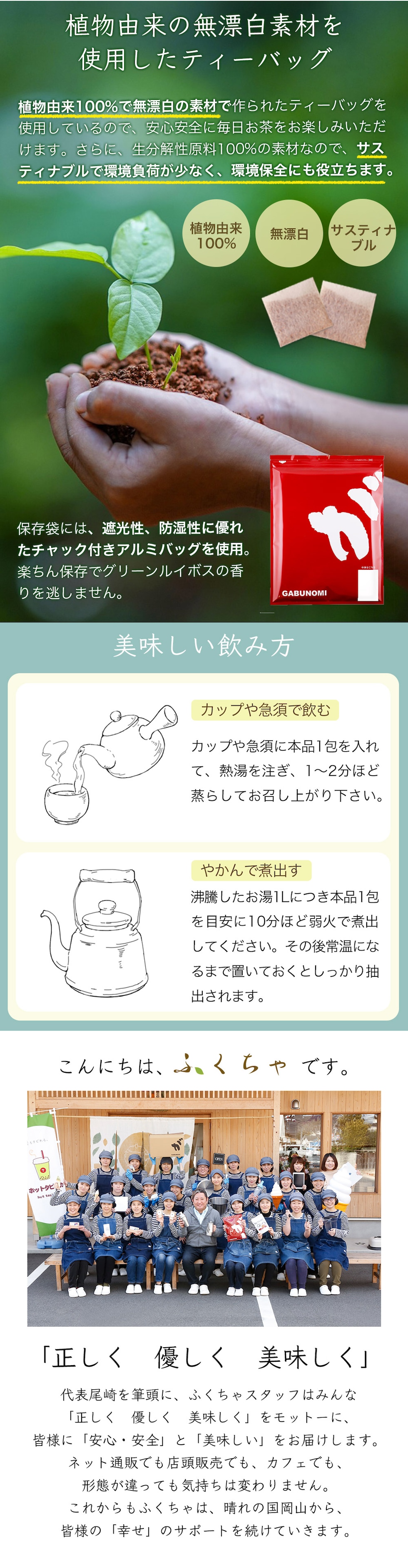 グリーンルイボスティーは南アフリカ原産の健康茶です。 クセが少なくあっさりとした味わい、爽やかな香りで小さなお子様でも違和感なくお召し上がりいただける、 栄養バランスに優れたノンカフェインティーです。 【グリーンルイボスティーがオススメな理由】 (1)ノンカフェイン 赤いルイボスティーと同じように、グリーンルイボスティーもノンカフェイン健康茶なので、カフェイン摂取を控えたい時もがぶ飲みできます。 (2)ミネラルたっぷり お子様がすくすくと育つ為に必要なミネラルが豊富に含まれており、小さな頃からずっと飲み続けることができる自然派の健康茶です。 また、健康だけではなく美容にうれしい成分もたっぷり含んでいます。 (3)品質の高いオーガニック茶葉のみを使用 ふくちゃのグリーンルイボスティーは、オーガニック茶葉のみを使用しています。 お茶のプロが南アフリカまで出向き、衛生管理の整った農場施設を指定して直接買い付けたものです。 直接買い付けることで常に品質の安定した健康茶をお客様にお届けすることができます。 |