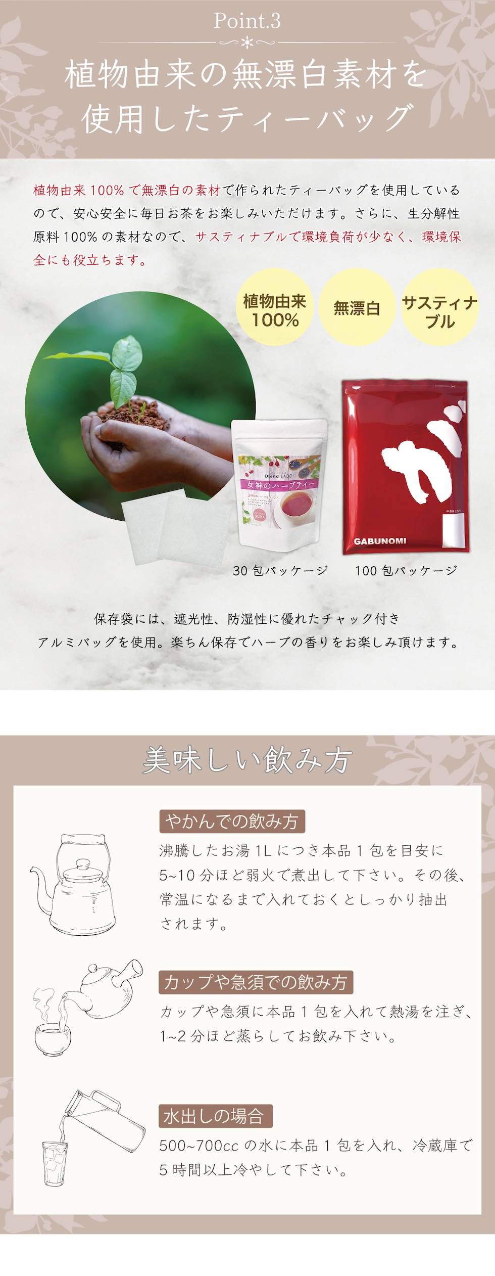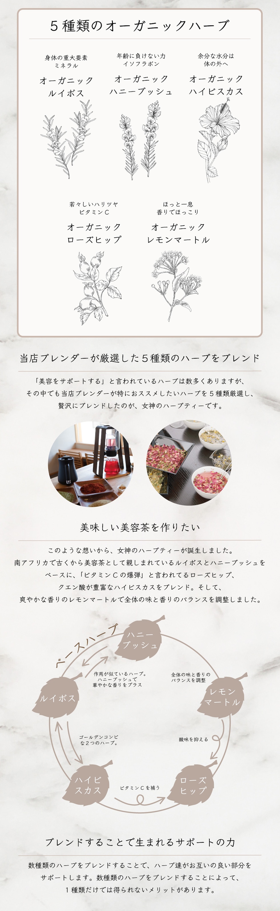 女性の「キレイになりたい」という思いを 応援するオリジナルハーブティーです。 「女性の美容を意識したティーを作りたい」という 想いから誕生したのが女神のハーブティーです。 気になる美容をサポートする 5つのハーブを贅沢にブレンドしました。 | |