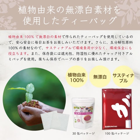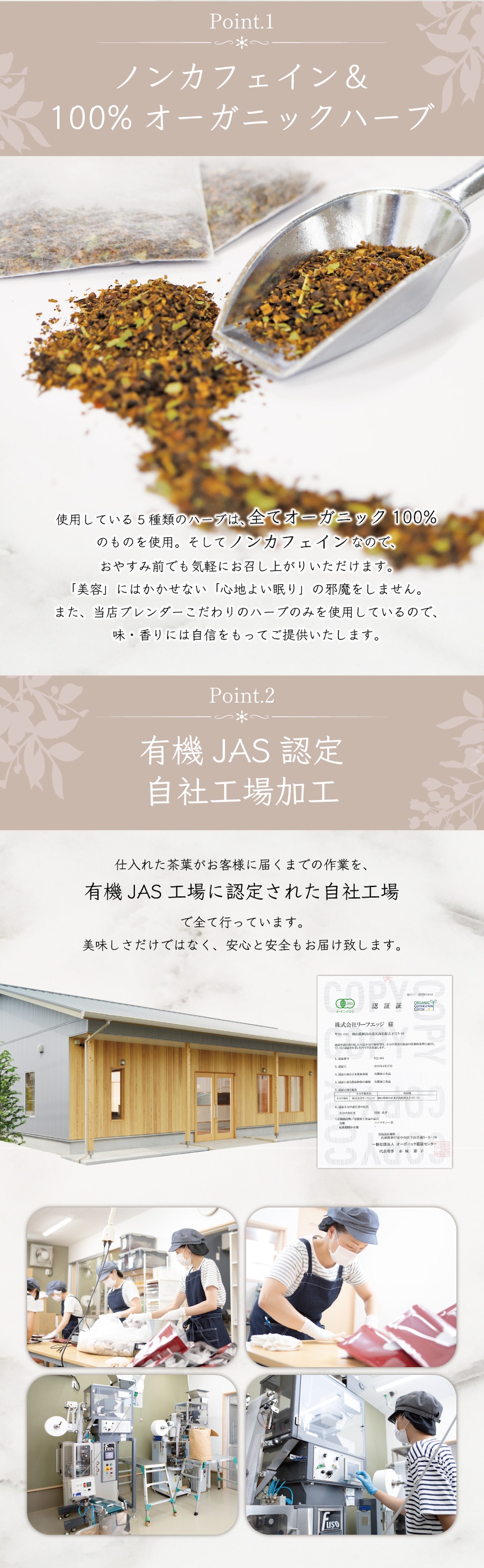 | 原材料名(原産国) | 有機ハニーブッシュ(南アフリカ共和国)、有機ルイボス(南アフリカ共和国)、有機ハイビスカス(エジプト)、有機ローズヒップ(チリ)、有機レモンマートル(オーストラリア) |