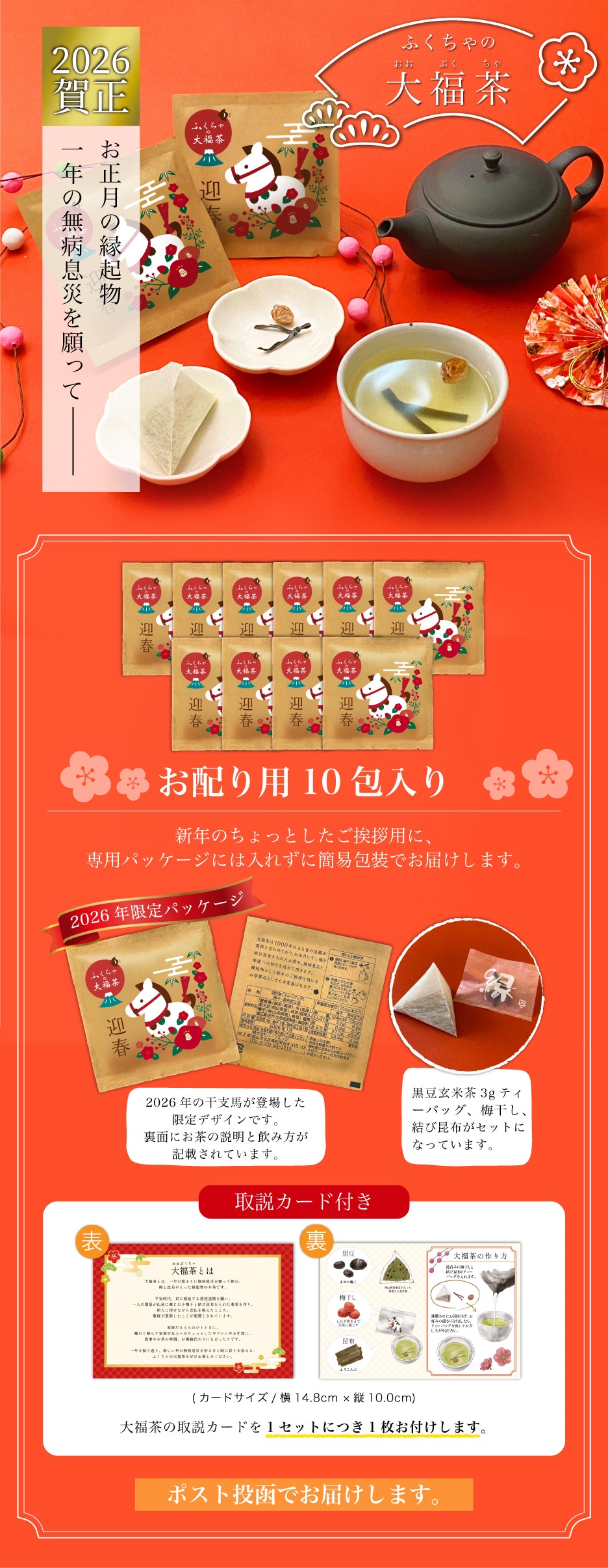 【10%OFFクーポン&ポイントUP!】大福茶 2026 お年賀 新年 挨拶 縁起物 無病息災 干支 お祝い お屠蘇 ギフト 10個入り お配り ギフト お茶 梅昆布茶 梅こんぶ茶 黒豆茶 玄米茶 ティーバッグ 梅干し 昆布 正月 セット sp10