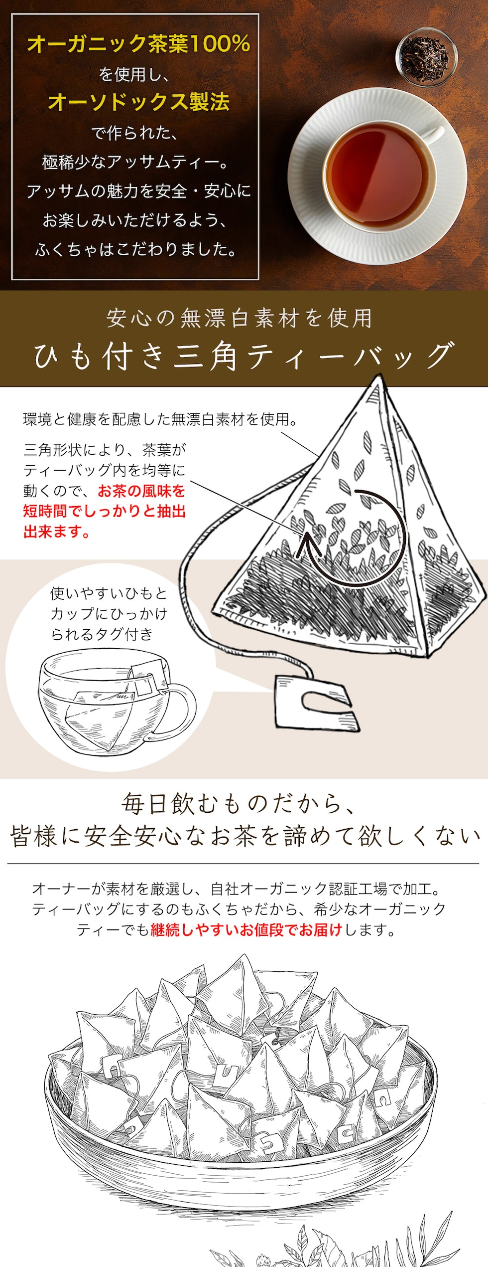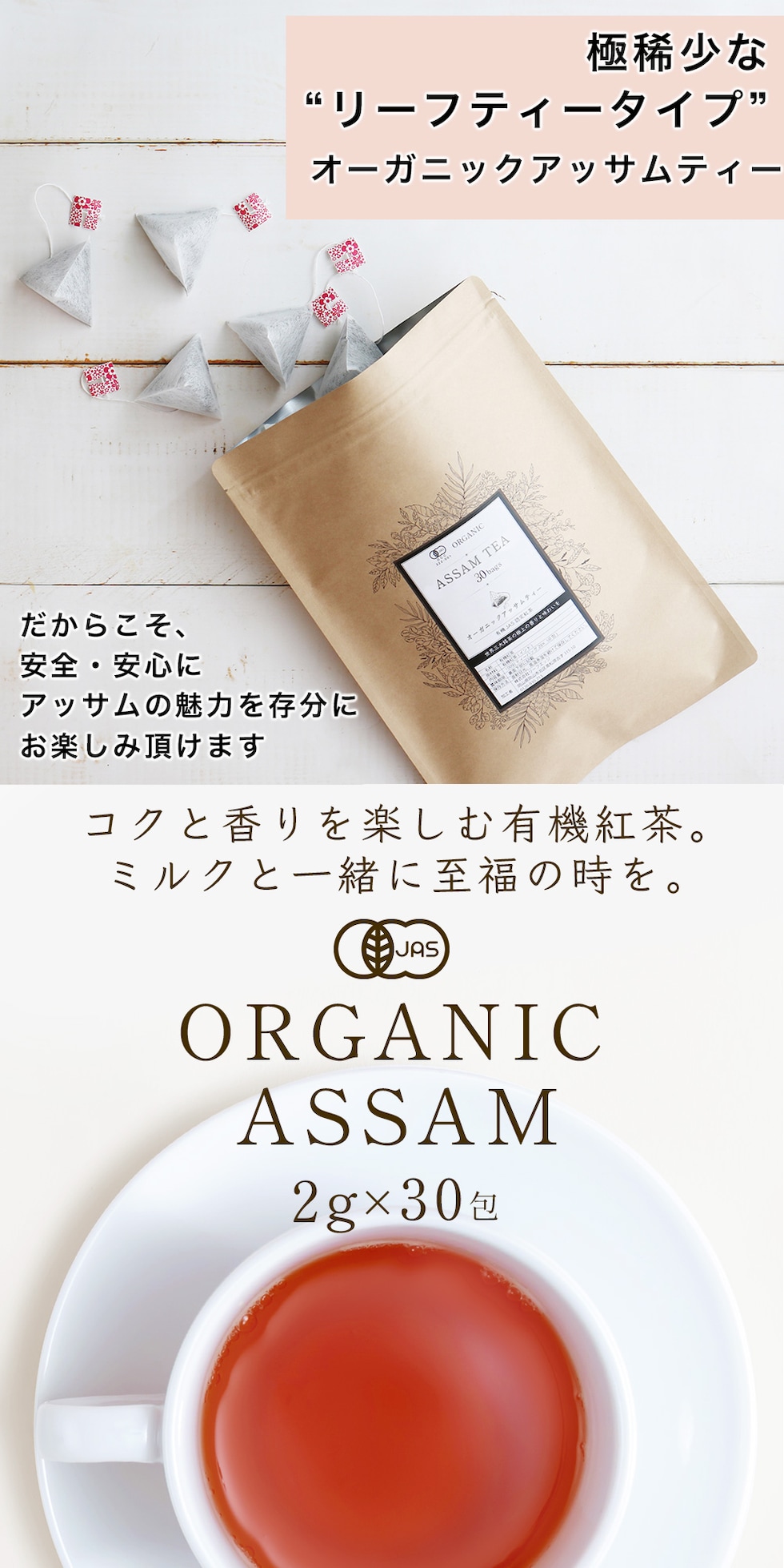アッサムティー オーガニック アッサム紅茶 アッサム 有機アッサム 紅茶 オーガニック紅茶 有機紅茶 ティーバッグ ティーパック 30包 60g(2g×30包) パック ミルクティー リーフティータイプ CTC製法じゃない 極希少 少量 お試しパック ふくちゃ hot