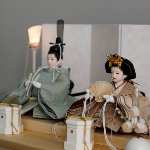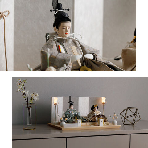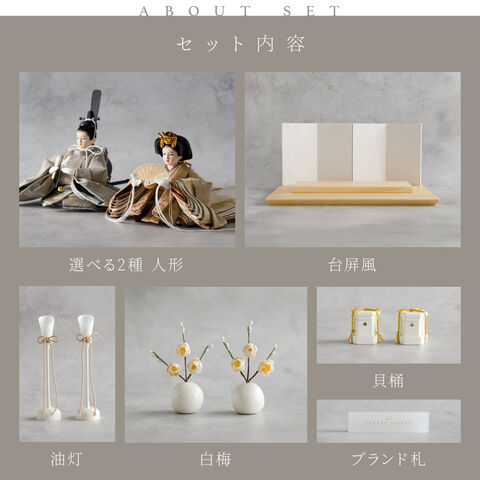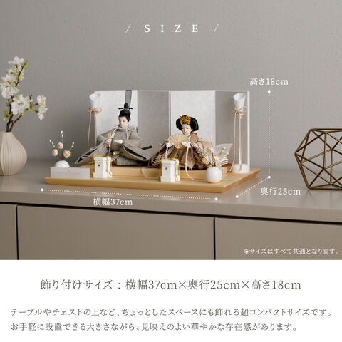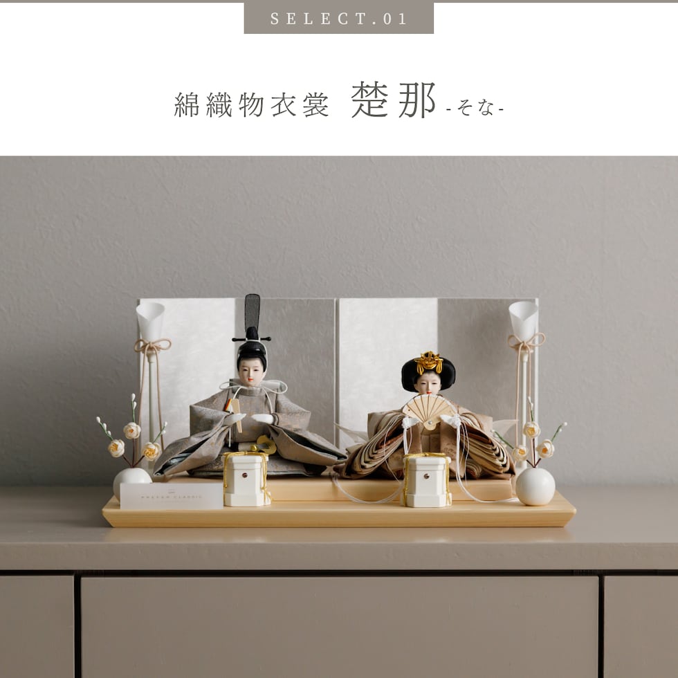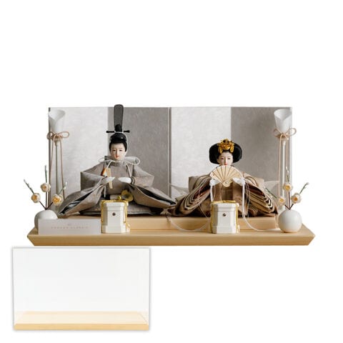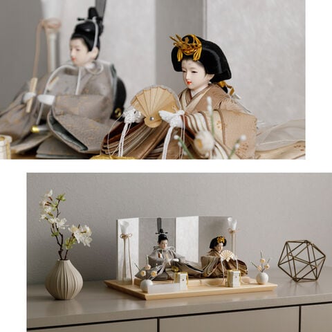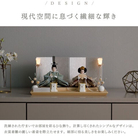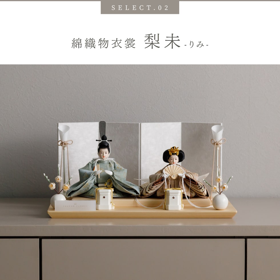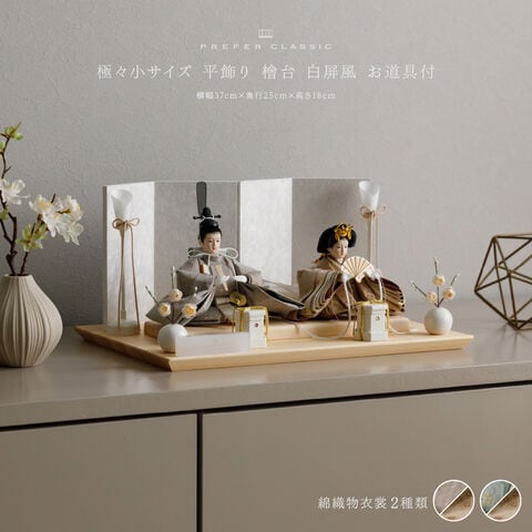 雛人形 コンパクト おしゃれ モダン 親王飾り インテリア お雛様 雛 高級 PREFER CLASSIC ひな人形 [檜台 白屏風 平飾り お道具付 貝桶 油灯 白梅 人形極々小サイズ 選べる綿織物衣裳2種類 楚那 梨未] 【楚那 ケース付属】