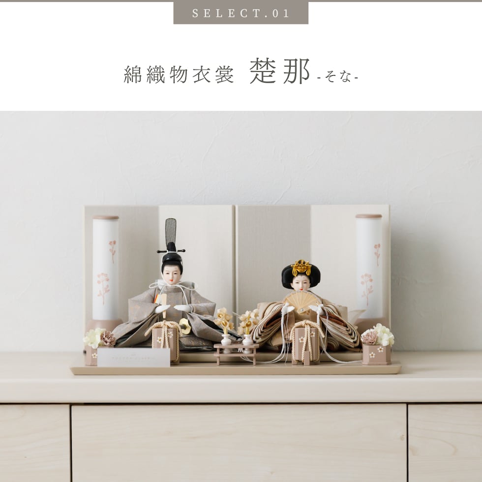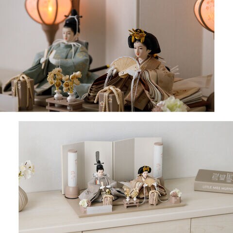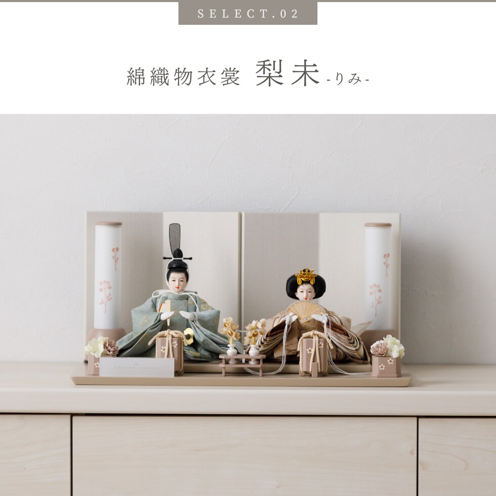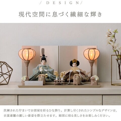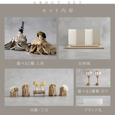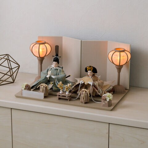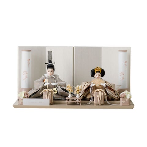 雛人形 コンパクト おしゃれ モダン 親王飾り インテリア お雛様 雛 高級 PREFER CLASSIC ひな人形 [ベージュ台 ホワイトグレー屏風 平飾り お道具付 貝桶花 人形極々小サイズ 選べる綿織物衣裳2種類 楚那 梨未 選べる灯り2種 雪洞 行灯] 【楚那・行灯 ケースなし】