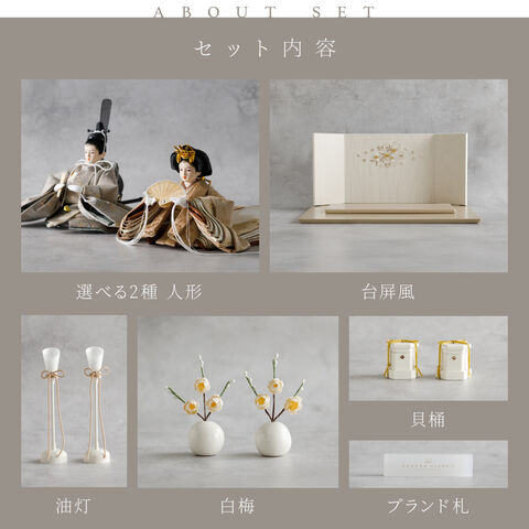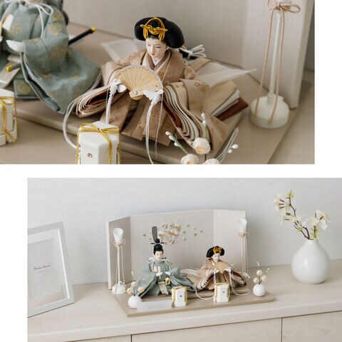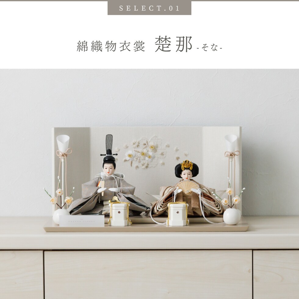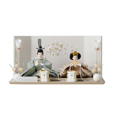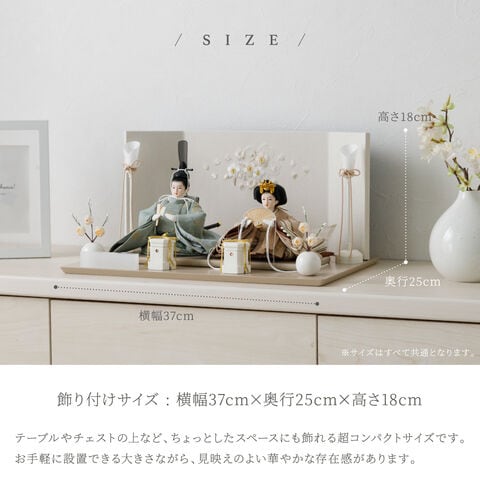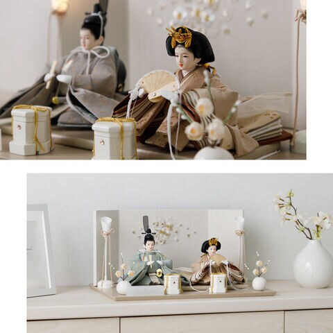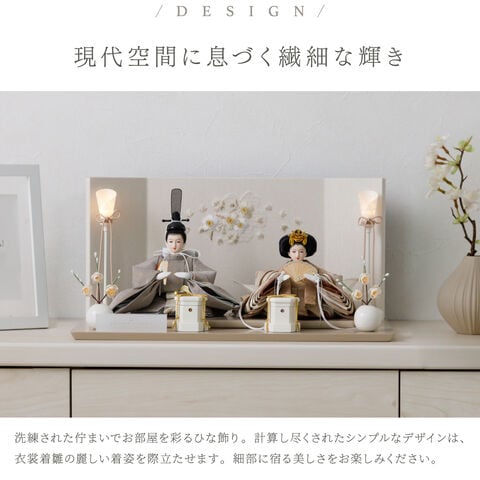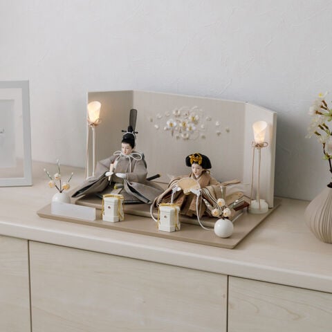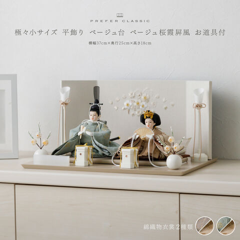 雛人形 コンパクト おしゃれ モダン 親王飾り インテリア お雛様 雛 高級 PREFER CLASSIC ひな人形 [ベージュ台 桜霞屏風 平飾り お道具付 貝桶 油灯 白梅 人形極々小サイズ 選べる綿織物衣裳2種類 楚那 梨未] 【梨未 ケースなし】