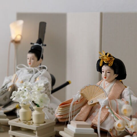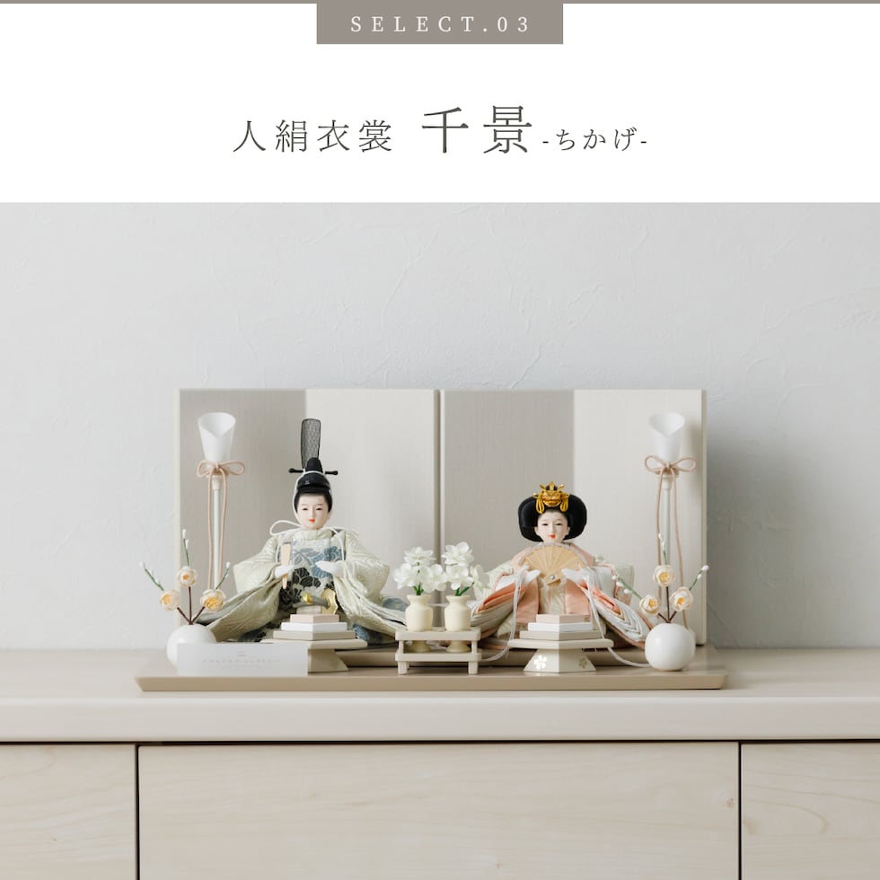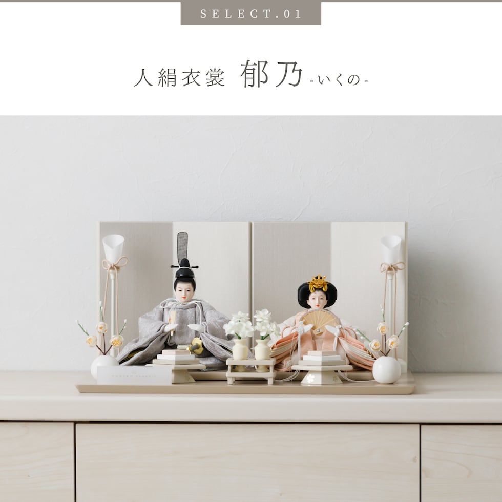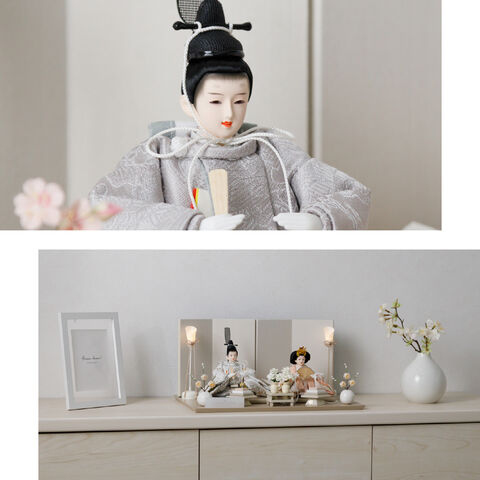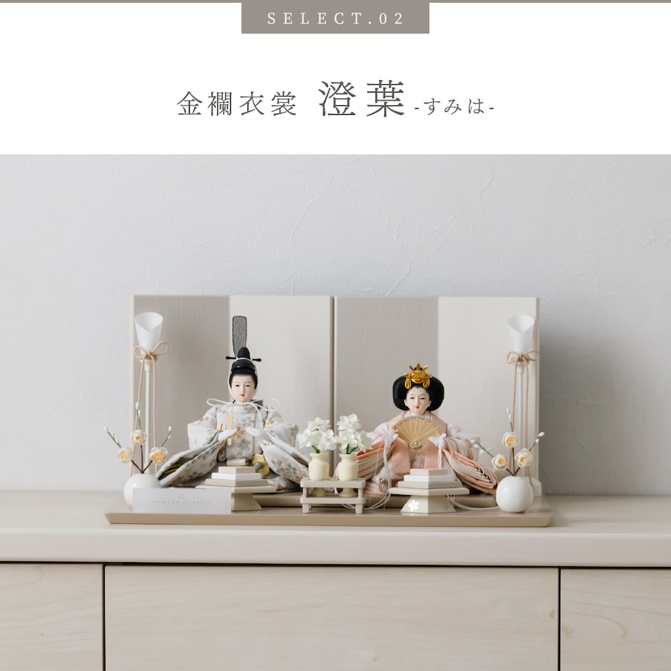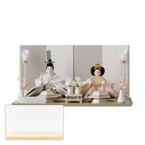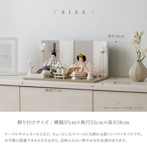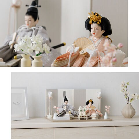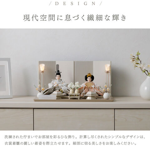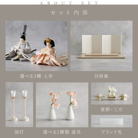 雛人形 コンパクト おしゃれ モダン 親王飾り インテリア お雛様 雛 高級 PREFER CLASSIC ひな人形 [ベージュ台 ホワイトグレー屏風 平飾り お道具付 菱餅三方 油灯 選べる道具 枝桜ピンク 白梅 人形極々小サイズ 選べる衣裳 澄葉 郁乃 千景] 【澄葉・桜ピンク ケース付属】