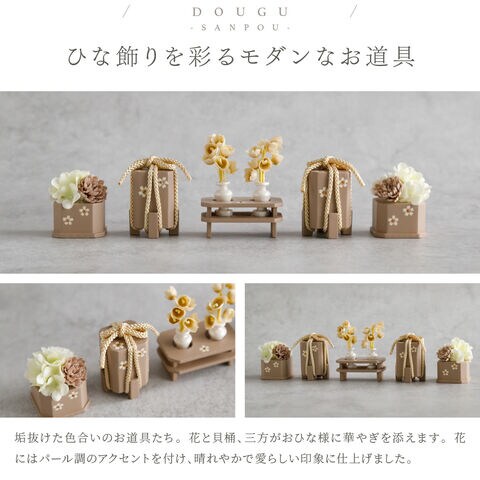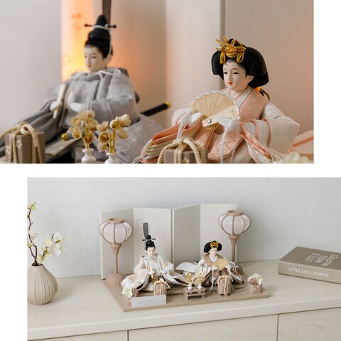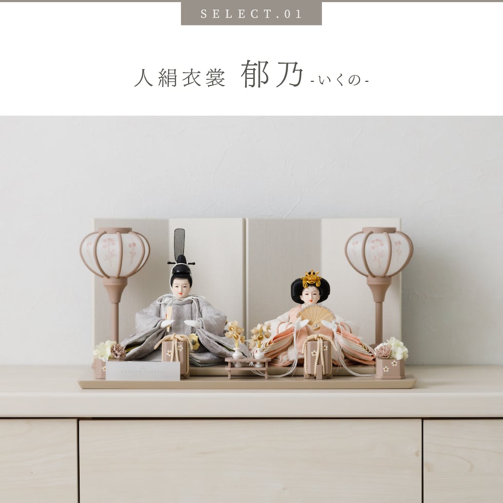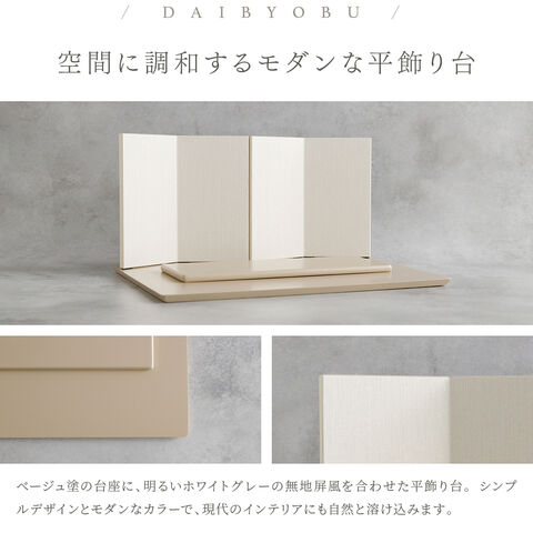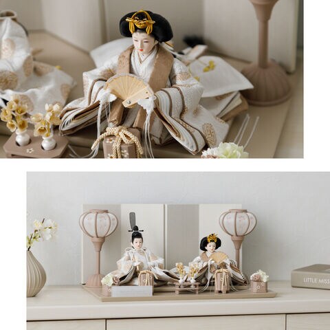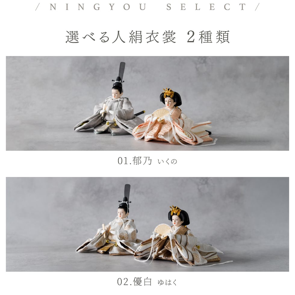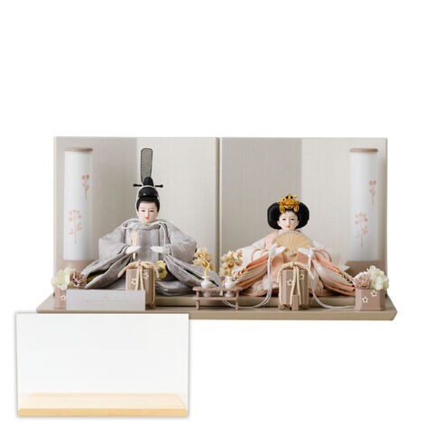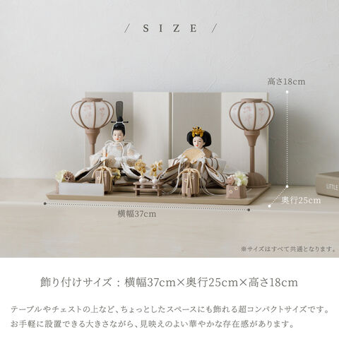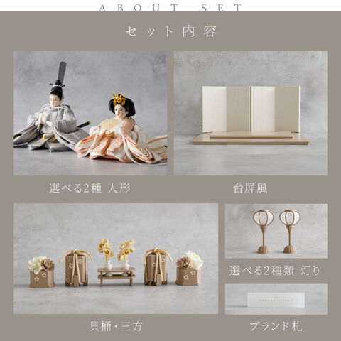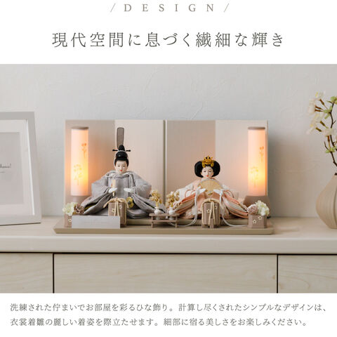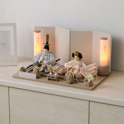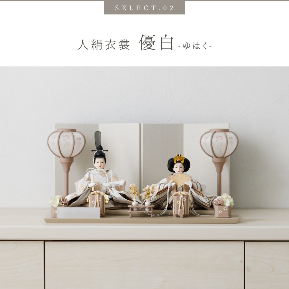 雛人形 コンパクト おしゃれ モダン 親王飾り インテリア お雛様 雛 高級 PREFER CLASSIC ひな人形 [ベージュ台 ホワイトグレー屏風 平飾り お道具付 貝桶花 人形極々小サイズ 選べる人絹衣裳2種類 郁乃 優白 選べる灯り2種 雪洞 行灯] 【郁乃・行灯 ケース付属】