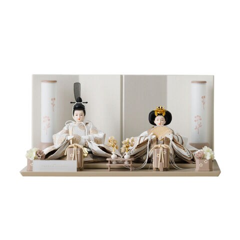 雛人形 コンパクト おしゃれ モダン 親王飾り インテリア お雛様 雛 高級 PREFER CLASSIC ひな人形 [ベージュ台 ホワイトグレー屏風 平飾り お道具付 貝桶花 人形極々小サイズ 選べる人絹衣裳2種類 郁乃 優白 選べる灯り2種 雪洞 行灯] 【優白・行灯 ケースなし】