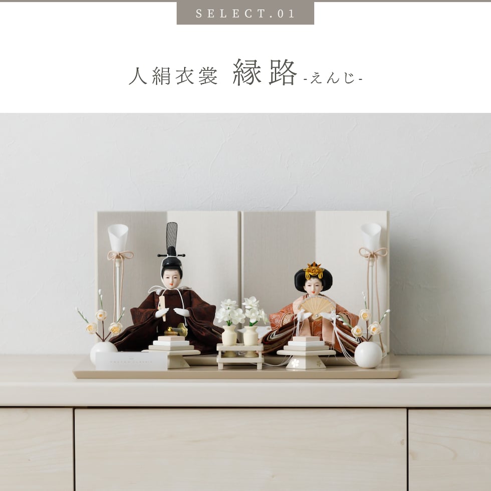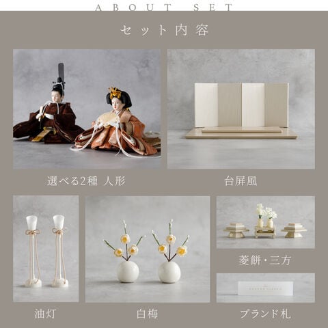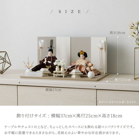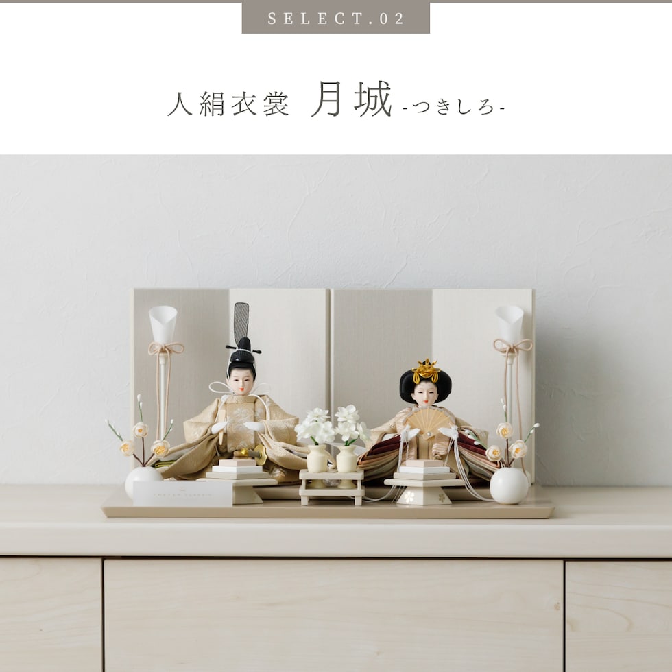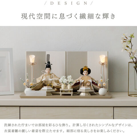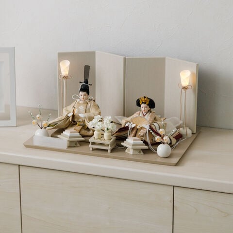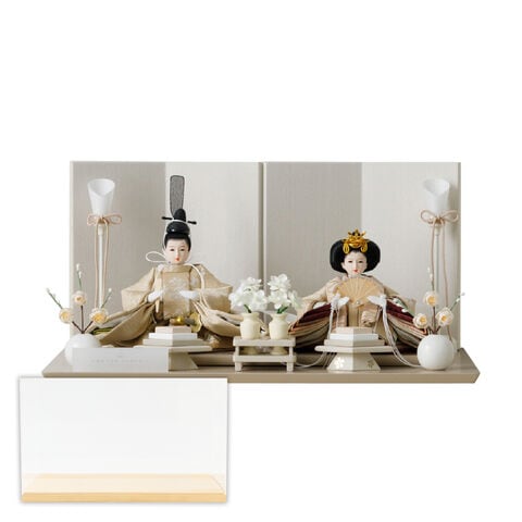雛人形 コンパクト おしゃれ モダン 親王飾り インテリア お雛様 雛 高級 PREFER CLASSIC ひな人形 [ベージュ台 ホワイトグレー屏風 平飾り お道具付 菱餅三方 油灯 白梅 人形極々小サイズ 選べる人絹衣裳2種類 縁路 月城] 【月城 ケース付属】