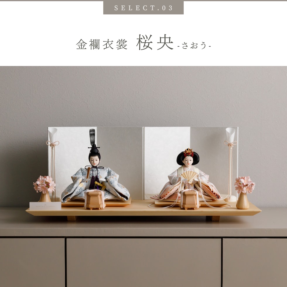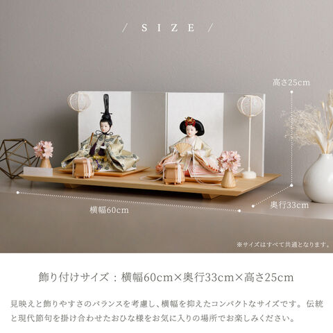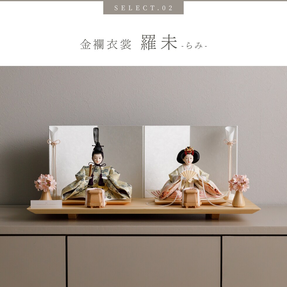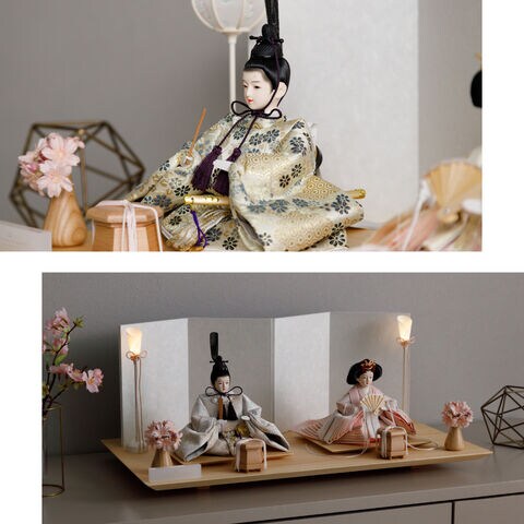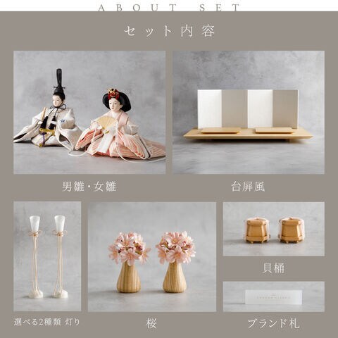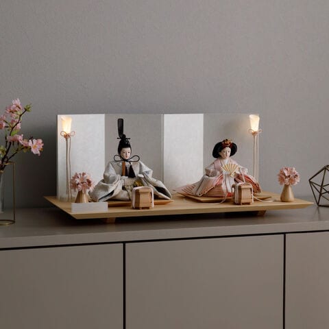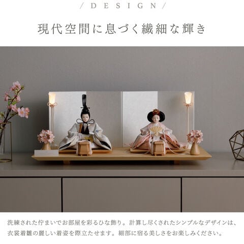雛人形 おしゃれ モダン 親王飾り インテリア お雛様 雛 高級 PREFER CLASSIC ひな人形 [檜台 白屏風 平飾り お道具付 和桜 貝桶 選べる灯り2種 油灯 雪洞 人形小サイズ 選べる金襴衣裳3種類 星欄 羅未 桜央] 【羅未 油灯】