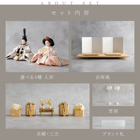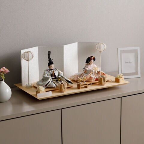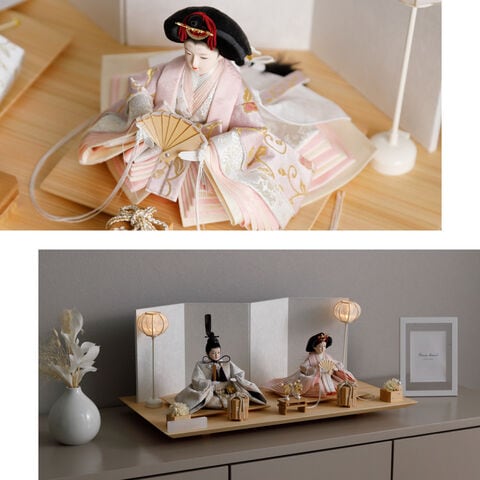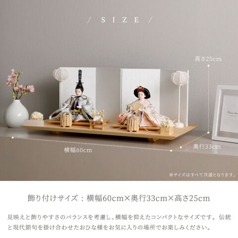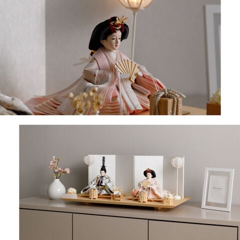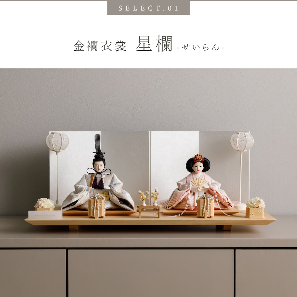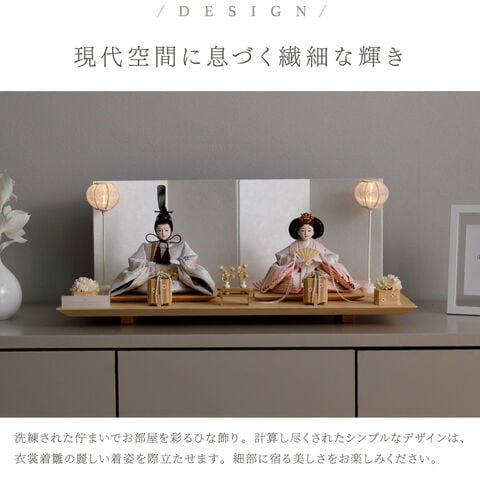 雛人形 おしゃれ モダン 親王飾り インテリア お雛様 雛 高級 PREFER CLASSIC ひな人形 [檜台 白屏風 平飾り お道具付 貝桶花 雪洞 人形小サイズ 選べる金襴衣裳4種類 星欄 羅未 桜央 絃凪] 【桜央】