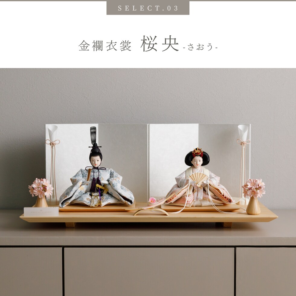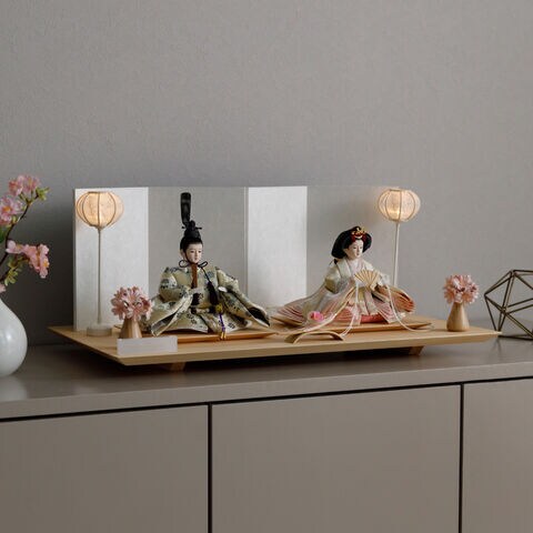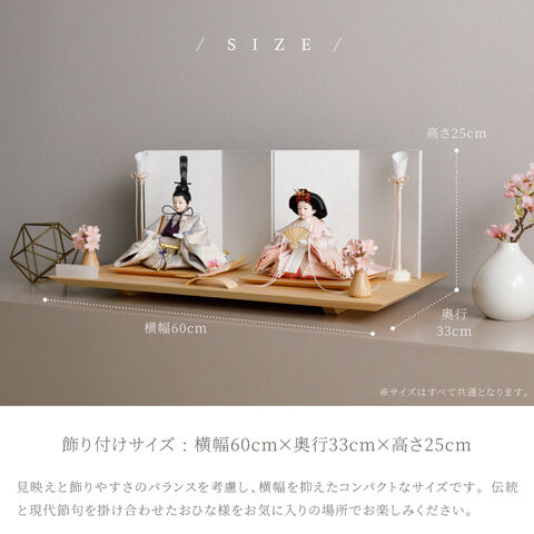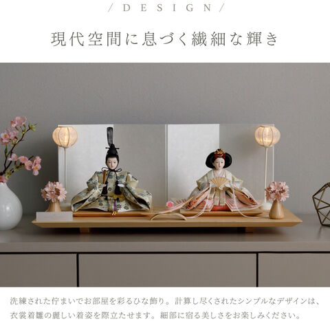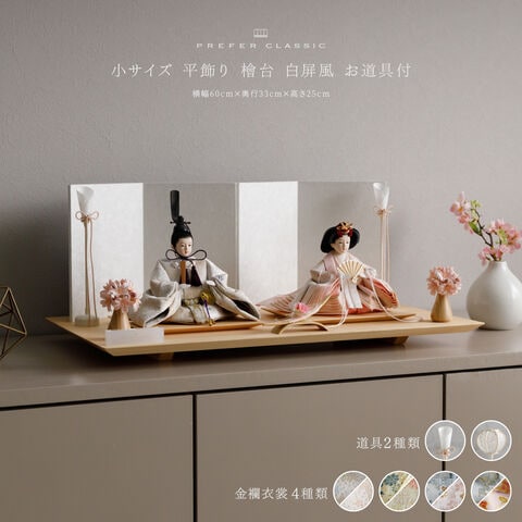 雛人形 おしゃれ モダン 親王飾り インテリア お雛様 雛 高級 PREFER CLASSIC ひな人形 [檜台 白屏風 平飾り お道具付 和桜 三方桜 選べる灯り2種 油灯 雪洞 人形小サイズ 選べる金襴衣裳4種類 星欄 羅未 桜央 絃凪] 【星欄 油灯】