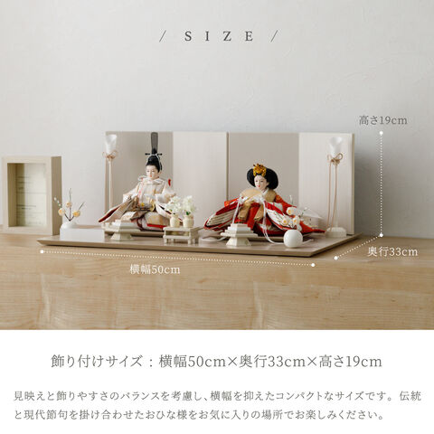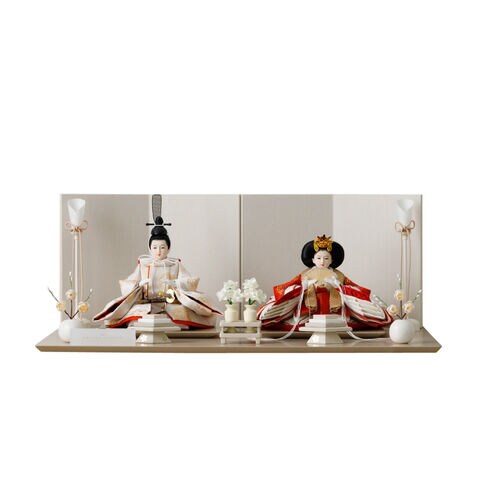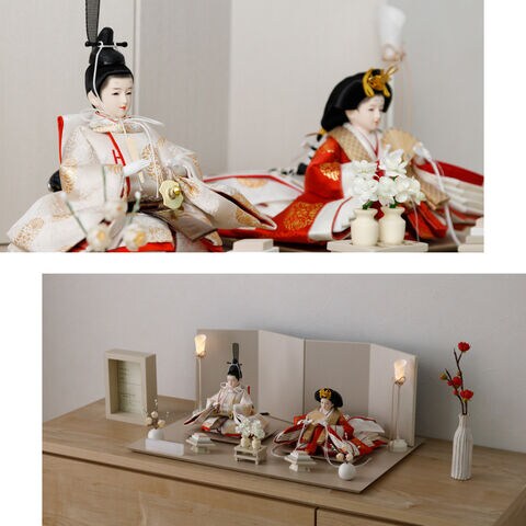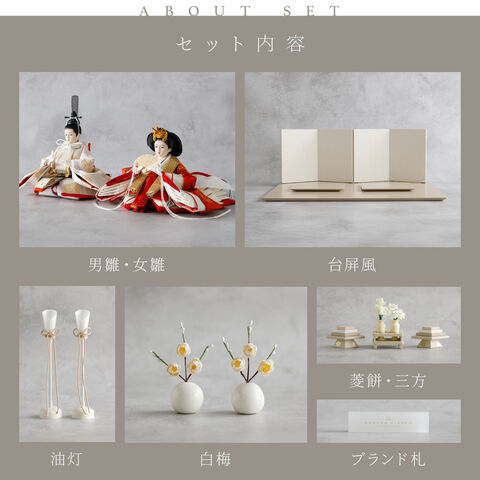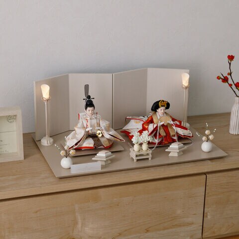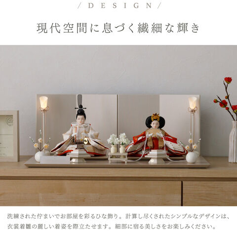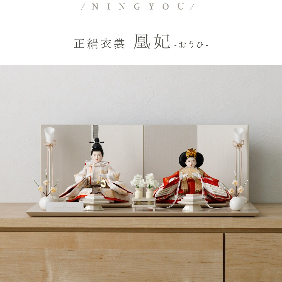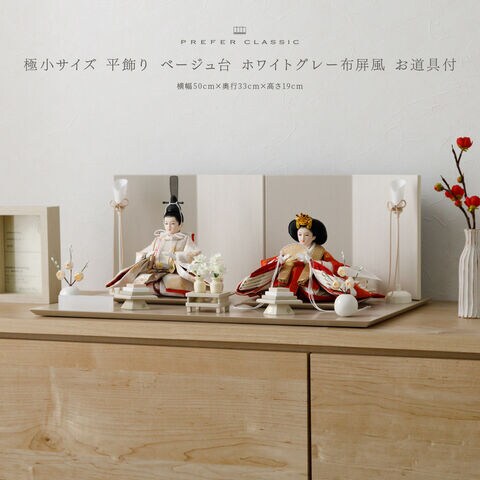 雛人形 おしゃれ モダン 親王飾り インテリア お雛様 雛 高級 PREFER CLASSIC ひな人形 [ベージュ台 ホワイトグレー屏風 平飾り お道具付 菱餅三方 油灯 白梅 人形極小サイズ 正絹衣裳 凰妃]