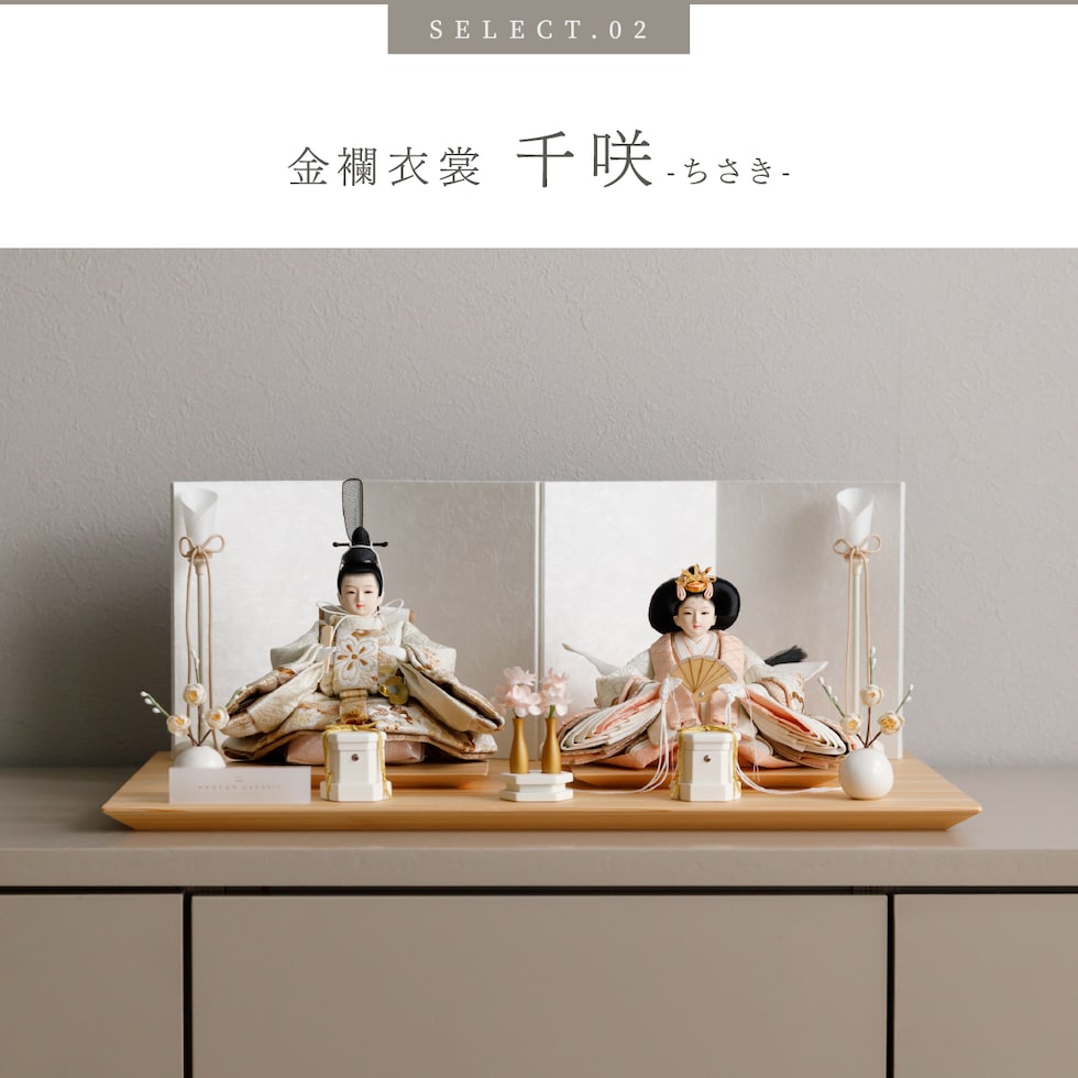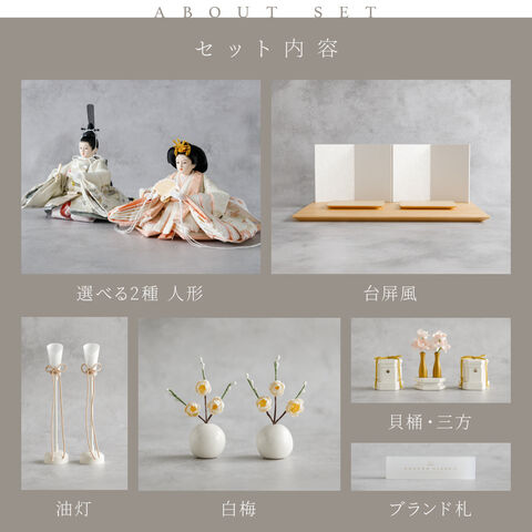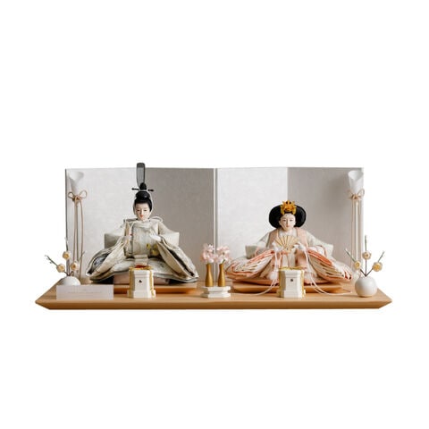 雛人形 おしゃれ モダン 親王飾り インテリア お雛様 雛 高級 PREFER CLASSIC ひな人形 [檜台 白屏風 平飾り お道具付 貝桶三方 油灯 白梅 人形極小サイズ 選べる金襴衣裳2種類 芽那 千咲] 【芽那】