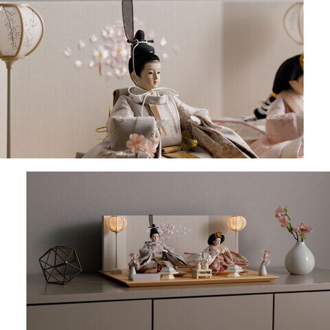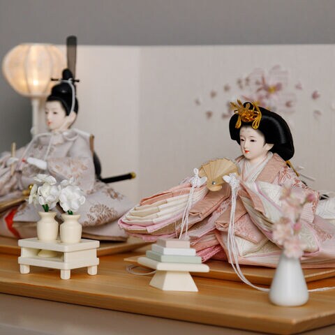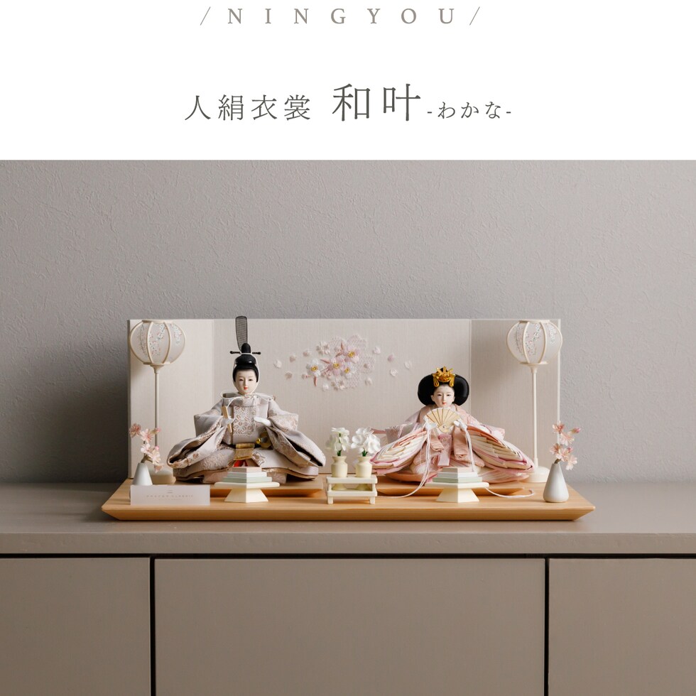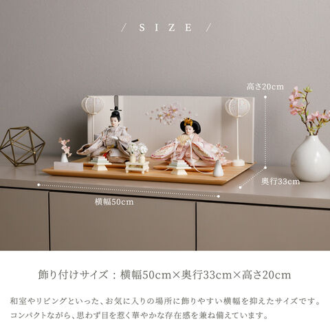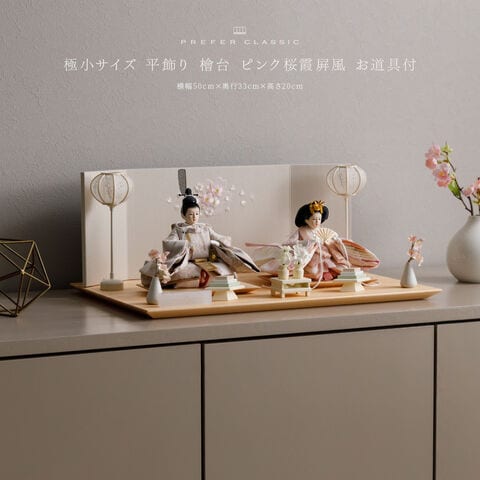 雛人形 おしゃれ モダン 親王飾り インテリア お雛様 雛 高級 PREFER CLASSIC ひな人形 [檜台 桜霞屏風 平飾り お道具付 菱餅三方 雪洞 枝桜ピンク 人形極小サイズ 人絹衣裳 和叶]