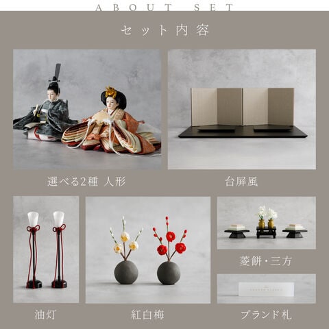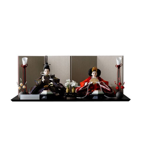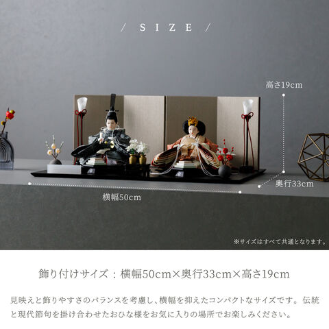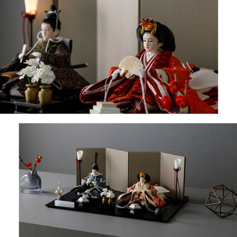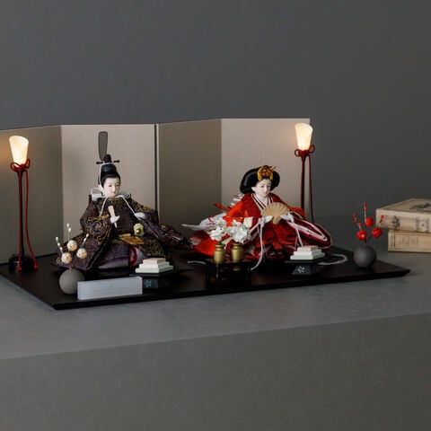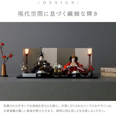 雛人形 おしゃれ モダン 親王飾り インテリア お雛様 雛 高級 PREFER CLASSIC ひな人形 [黒塗台 ベージュ屏風 平飾り お道具付 菱餅三方 油灯 紅白梅 人形極小サイズ 選べる人絹衣裳2種類 玖恩 紺紅] 【紺紅】