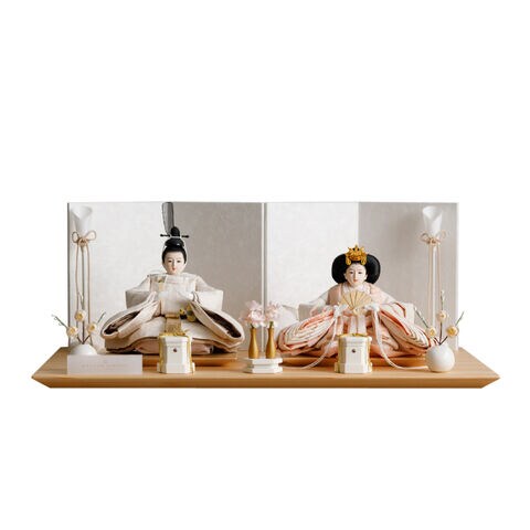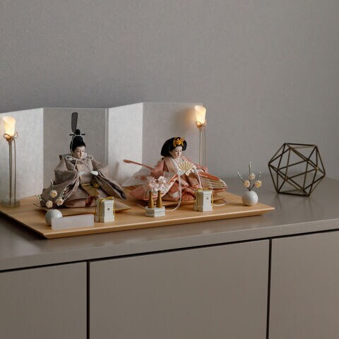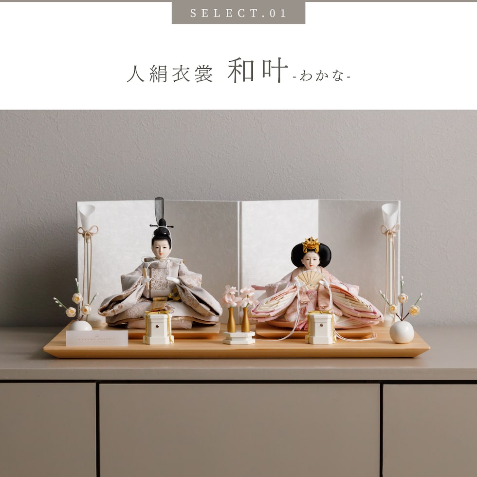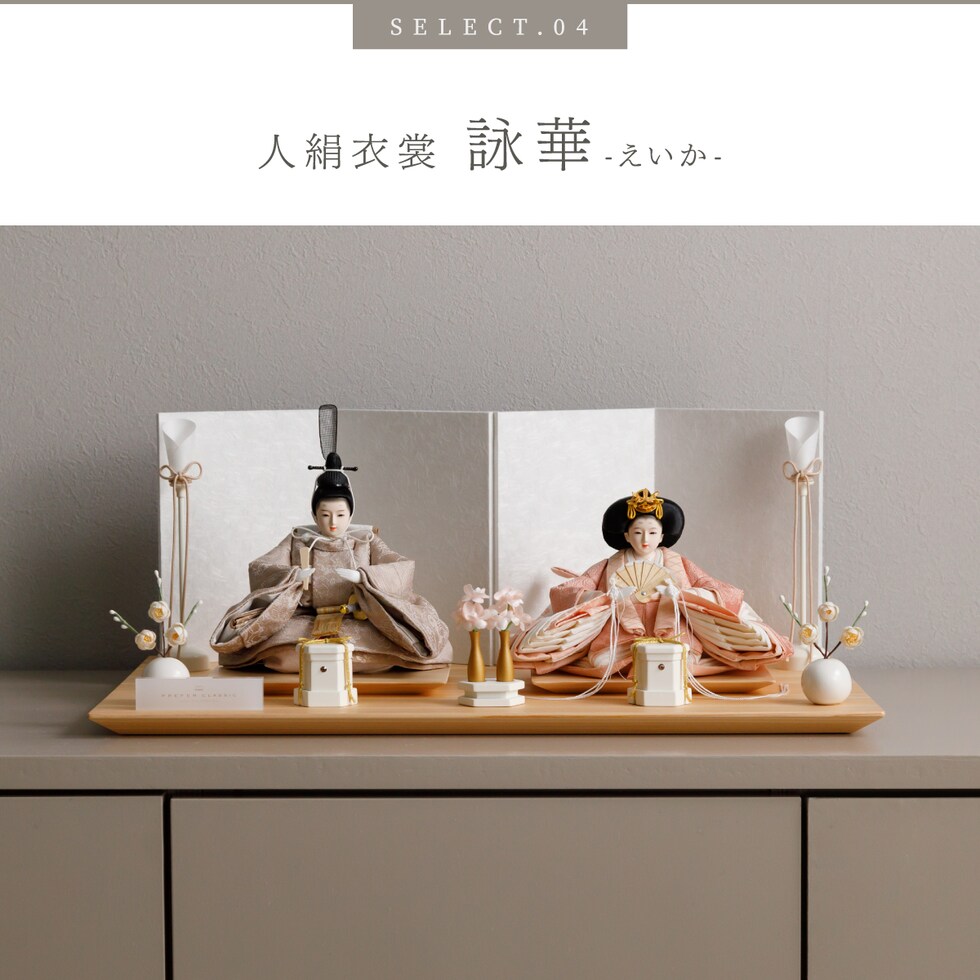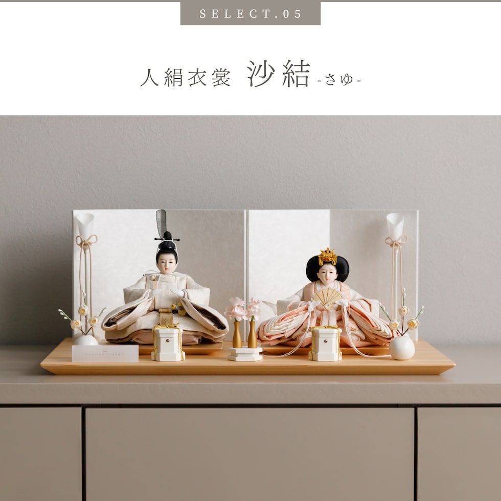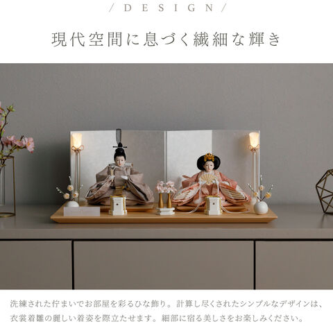 雛人形 おしゃれ モダン 親王飾り インテリア お雛様 雛 高級 PREFER CLASSIC ひな人形 [檜台 白屏風 平飾り お道具付 貝桶三方 油灯 白梅 人形極小サイズ 選べる人絹衣裳6種類 和叶 蒼珠 蔦代 詠華 沙結 此果] 【沙結】