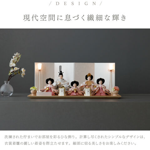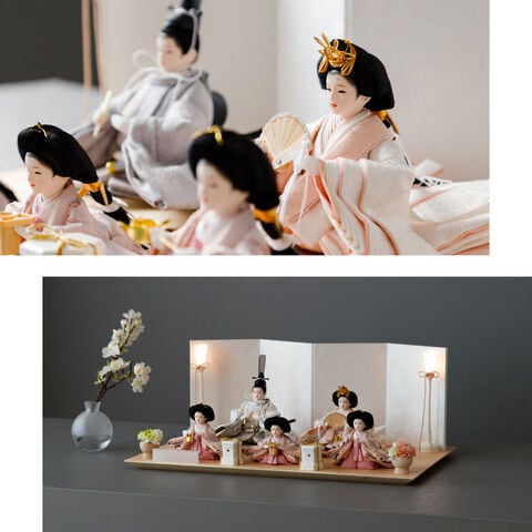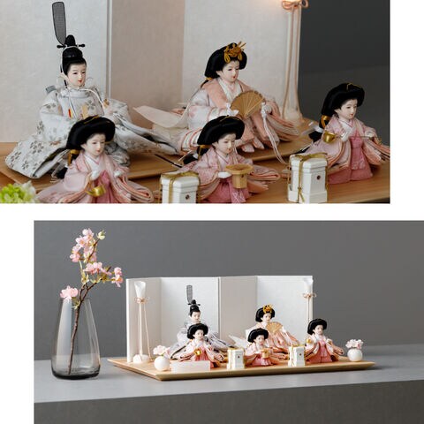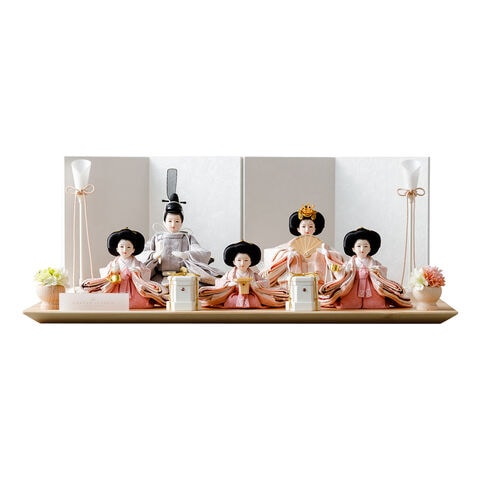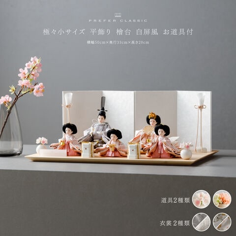 雛人形 おしゃれ モダン 五人飾り 官女 インテリア お雛様 雛 高級 PREFER CLASSIC ひな人形 [檜台 白屏風 平飾り お道具付 貝桶 油灯 選べる道具2種類 桃花 桜橘 人形極々小サイズ 選べる金襴人絹衣裳2種類 郁乃 澄葉] 【郁乃 桜橘】