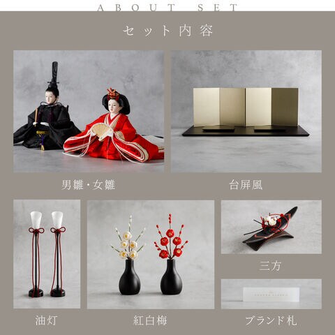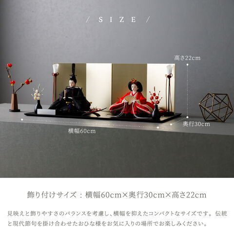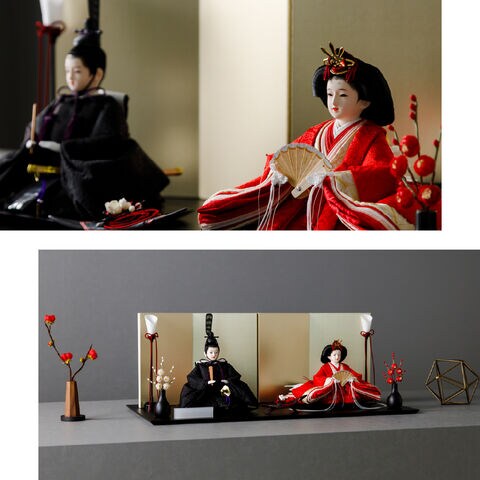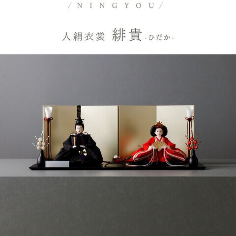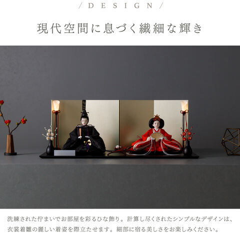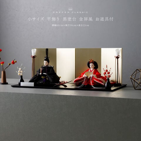 雛人形 おしゃれ モダン 親王飾り インテリア お雛様 雛 高級 PREFER CLASSIC ひな人形 [黒塗台 金屏風 平飾り お道具付 三方梅 油灯 紅白梅 人形小サイズ 人絹衣裳 緋貴]