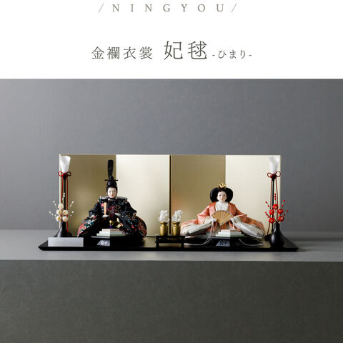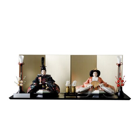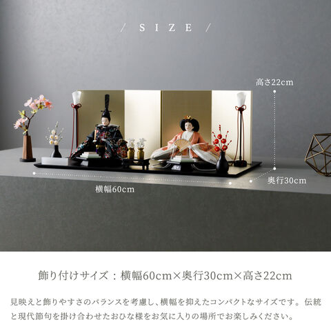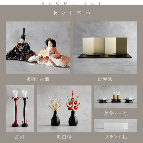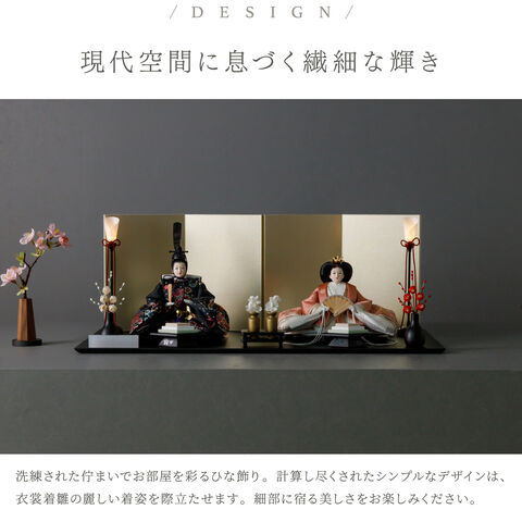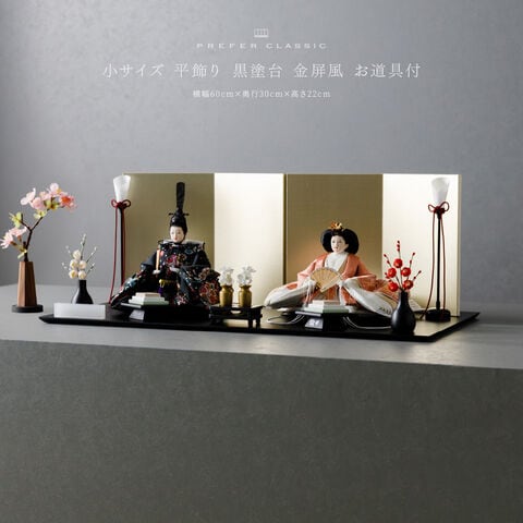 雛人形 おしゃれ モダン 親王飾り インテリア お雛様 雛 高級 PREFER CLASSIC ひな人形 [黒塗台 金屏風 平飾り お道具付 紅白梅 菱餅三方 油灯 人形小サイズ 金襴衣裳 妃毬]