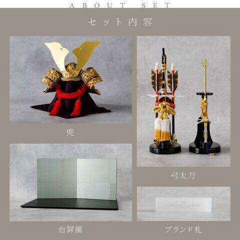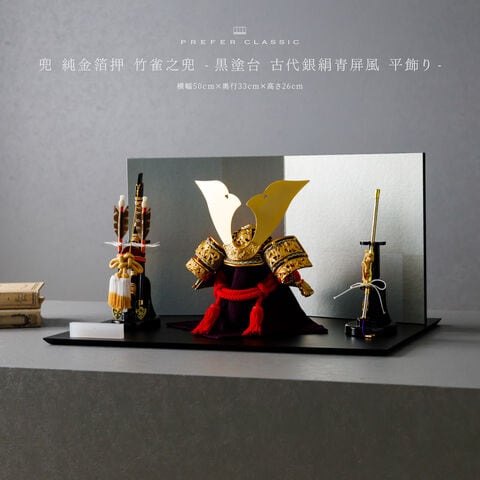 五月人形 おしゃれ 兜飾り 兜 モダン インテリア 高級 5月人形 PREFER CLASSIC 五月人形[黒塗台 古代銀絹青屏風 平飾り 弓太刀 KEI 純金箔押 竹雀之兜] 大鍬形