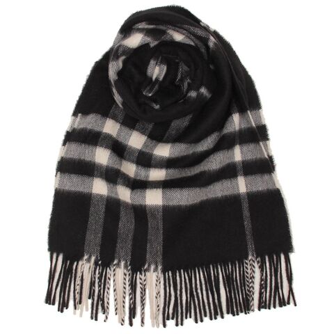 BURBERRY(バーバリー)のマフラーが入荷しました☆モノトーンでクラシカルなチェックをあしらった、モダンな印象の1枚です。端には毛足の長いフリンジを施し、さりげないアクセントをプラス。合わせるスタイルを選ばずご使用いただけるので、デイリーにはもちろん、通勤や通学などの幅広いシーンでも活躍してくれます。