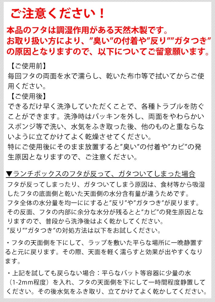 ※電子レンジをご利用の際は必ずフタを外してください。容器をフタやラップ、アルミ箔やシート等で覆ったまま加熱しないでください。 ※空のまま加熱しないてください。 ※直火、IHヒーター、オーブン、グリル等での加熱はできません。 ※本品は完全密封ではありません。汁もれする場合があるので、持ち運ぶ際は水平な状態を保てるようご注意ください。 ※使用後は早めに汚れを落としよく乾かしてください。汚れたままの放置、漬け置きはおやめください。 ※本品のフタは調湿作用がある天然木製です。お取り扱い方により、「臭いの付着」や「反り」「がたつき」 の原因となりますので、以下についてご留意願います。 【ご使用前】 毎回フタの両面を水で濡らし、乾いた布巾等で拭いてからご使用ください。 【ご使用後】 できるだけ早く洗浄していただくことで、各種トラブルを防ぐことができます。洗浄時はパッキンを外し、両面をやわらかいスポンジ等で洗い、水気をふき取った後、他のものと重ならないように立てかけてよく乾燥させてください。 特にご使用後にそのまま放置すると「臭いの付着」や「カビ」の原因となりますのでご注意ください。 |