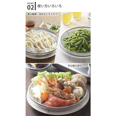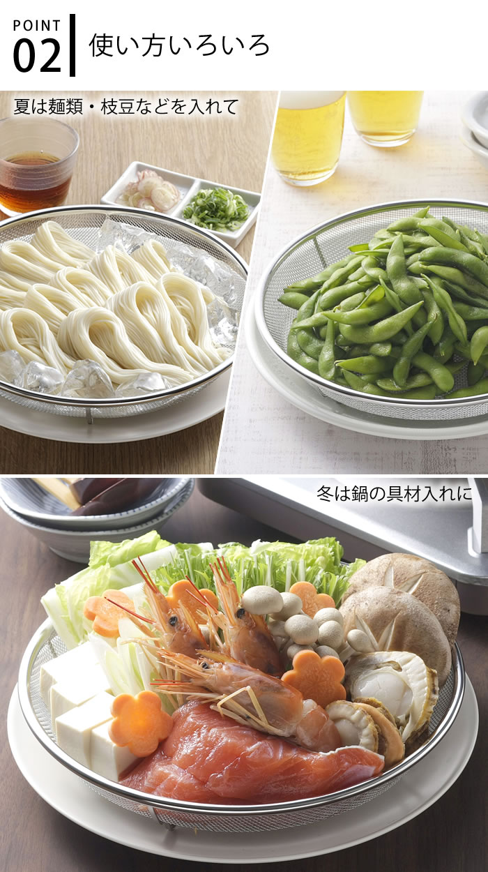 蒸し料理以外に野菜などの水切りや、揚げ物の油切り、麺類の盛り付けなど使い方いろいろ。