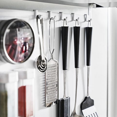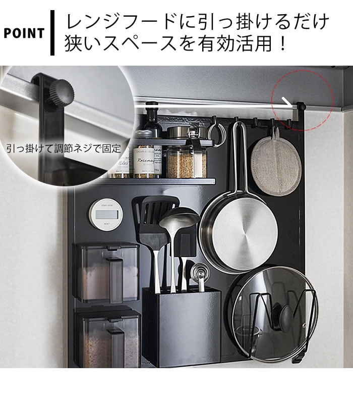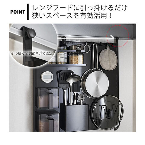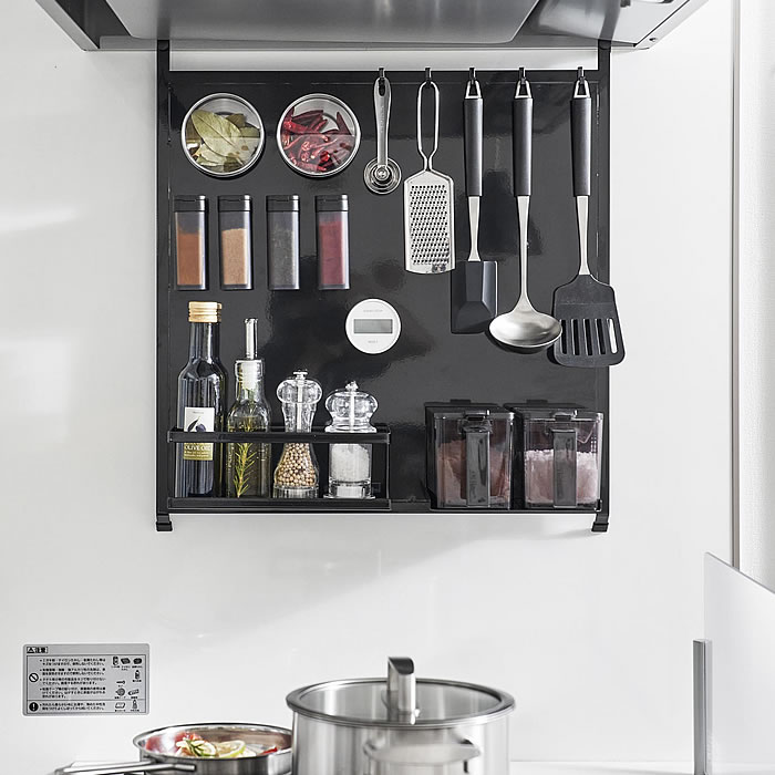 おたま、フライ返しなどの小物など取っ手のある物は付属のフックに引っ掛けて収納できるのでサッと取り出しOK。パネルは調節ネジでしっかり固定できて安心。油跳ね・水跳ねガードとしても便利です。