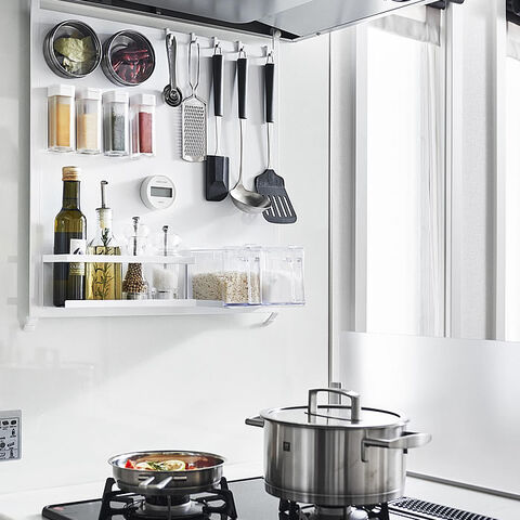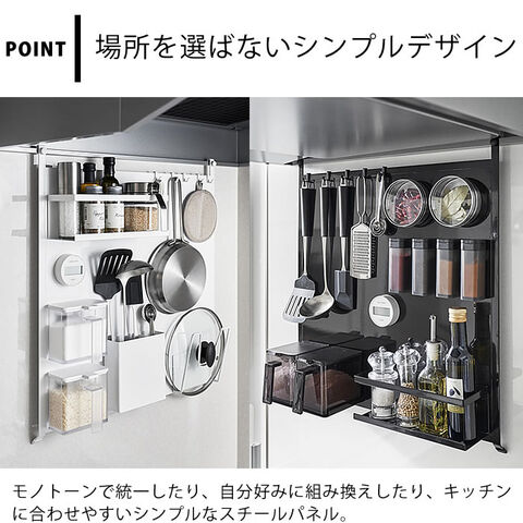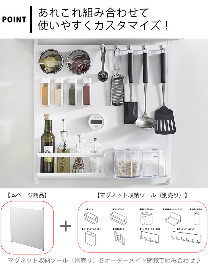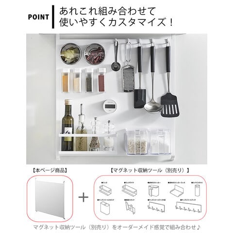 コンロ・シンク・調理場などキッチンの空いたスペースを有効活用できるスチールパネル。別売りのマグネットアイテムやツールをお好みの位置に取り付けて、自分だけのオリジナル収納がつくれます。