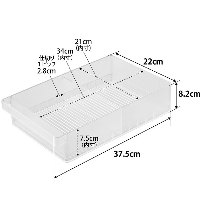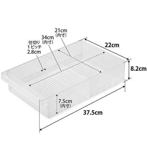 サイズ 外寸:約 W37.5×D22×H8.2cm 内寸:約 W34×D21×H7.5cm 仕切り1ピッチ:2.8cm |