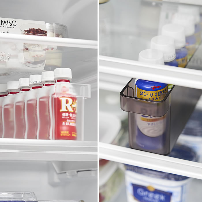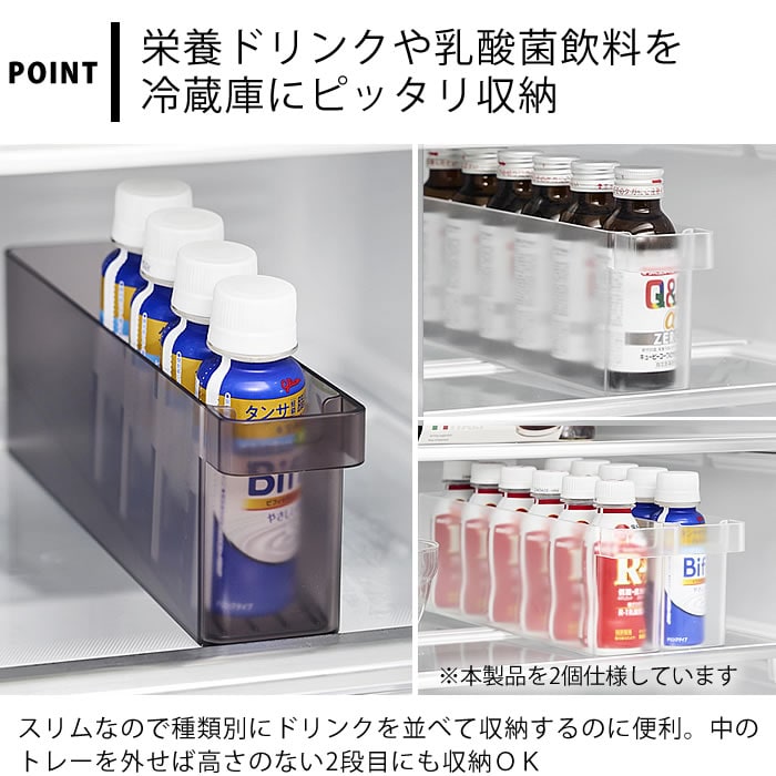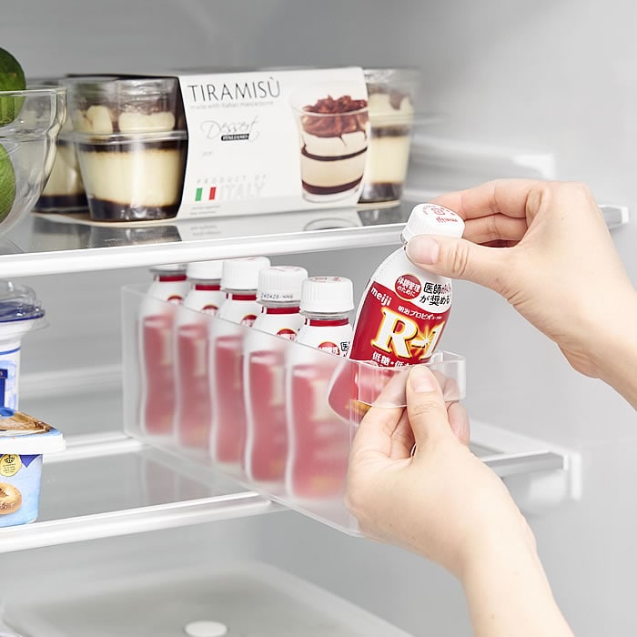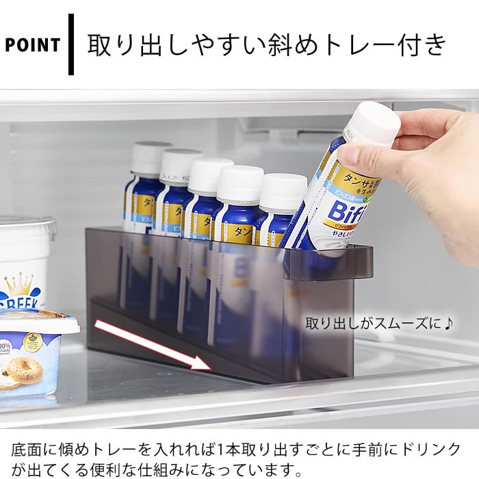 縦1列にスッキリと収納 冷蔵庫中で収納しにくいミニドリンクを縦1列にスッキリと収納できます。斜めトレーを底に入れることで、ドリンクを1本取り出すごとに後ろのドリンクがスライドする便利な収納ケースです。 スリムなので種類別でドリンクを並べて収納するのに便利。斜めトレーを外せば冷蔵庫内の高さのない上段にも収納できます。食器棚やストックルームなど省スペースでの整理整頓にもおすすめ。 ![]() ![]() ![]() ![]() ![]() ![]() ![]() ![]() |