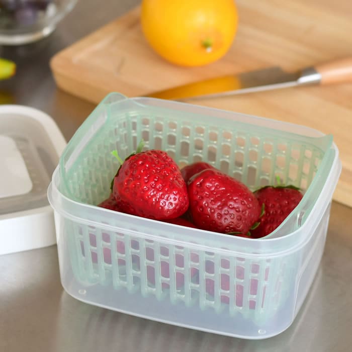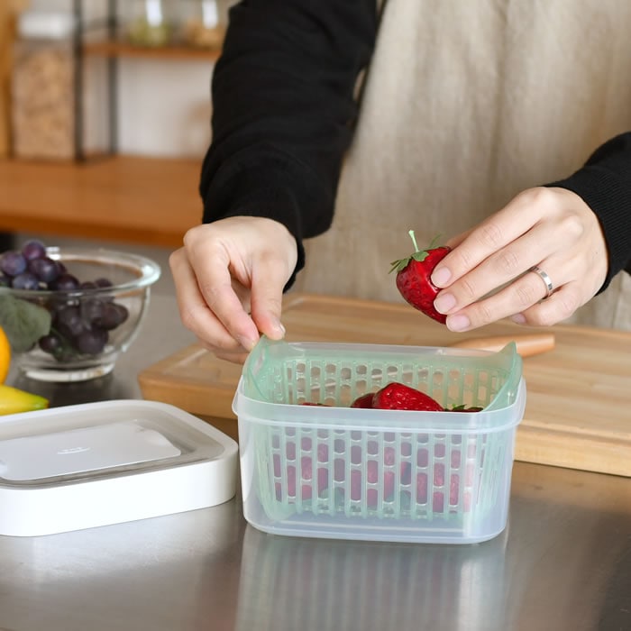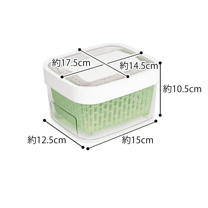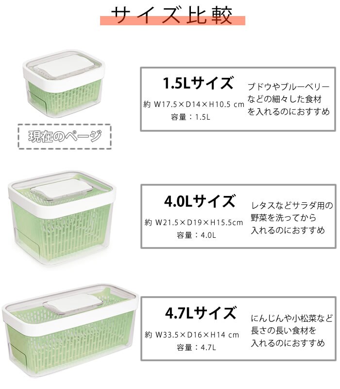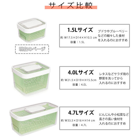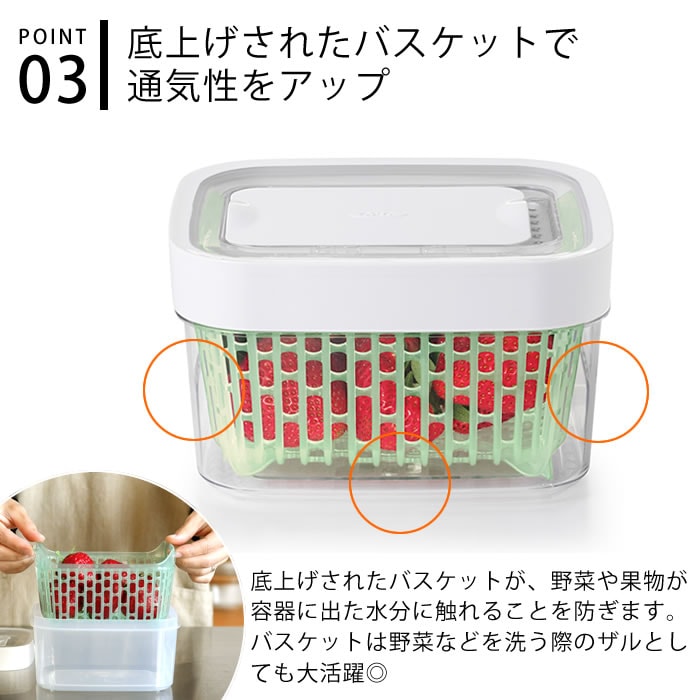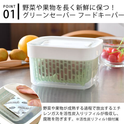 野菜・果物を長く新鮮に保つ! 野菜や果物を長く新鮮に保つことができるフードキーパー! 活性炭が野菜から出るエチレンガスを吸収して野菜を新鮮に保存してくれます。 スライド開閉できる通気孔で、食材ごとに最適な湿度をキープ! 中にあるバスケットが通気性を良くし、容器側面や底面の水分が食材に触れにくくなり腐敗を防ぎます。 バスケットはハンドル付きで取り出しやすく、野菜の水切り用コランダーとしても使用可能。 ![]() ![]() ![]() ![]() ![]() ![]() ![]() ![]() ![]() ![]() |