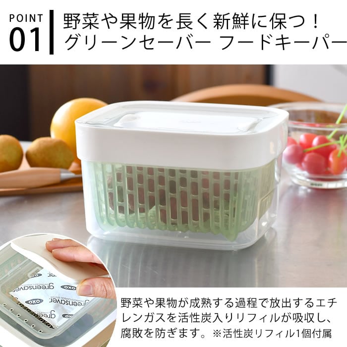 保存容器 プラスチック 四角 オクソー グリーンセーバー フードキーパー 1.5 フードコンテナー 食洗機対応 冷蔵庫 OXO 保管 透明 容器 食材 活性炭入り フードキーパー コランダー 鮮度 おしゃれ 保存 野菜ストッカー