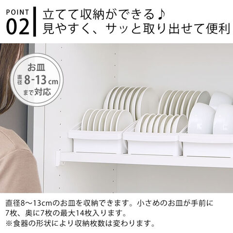 対応サイズ お皿:直径8から13cm(最大手前に約7枚、奥に約7枚収納可能) ※食器の深さや形状により、対応サイズでも入らないことがあります。 |