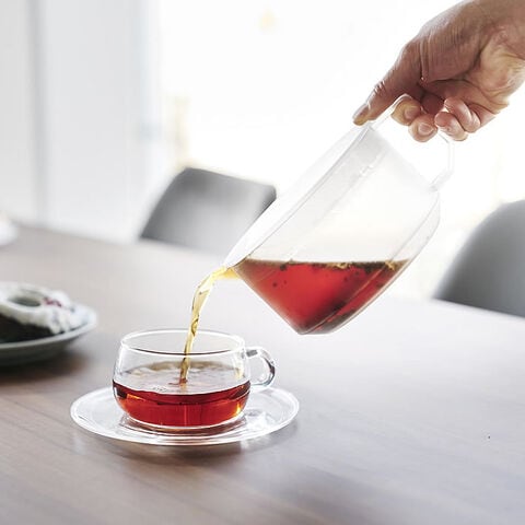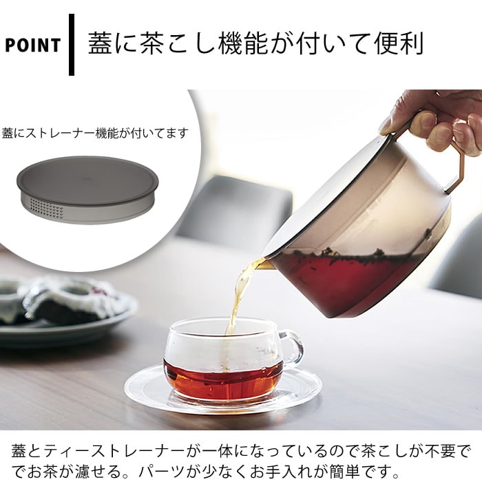 蓋に茶こし機能が付いて茶葉を濾せるシンプルなティーポットです。蓋とティーストレーナーが一体になっているのでパーツが少なくお手入れが簡単です。
