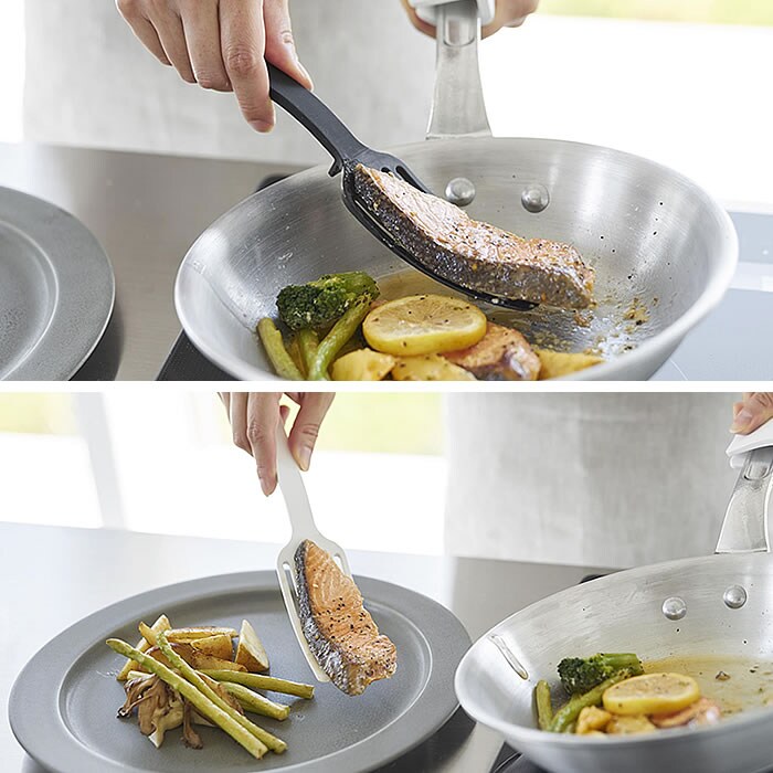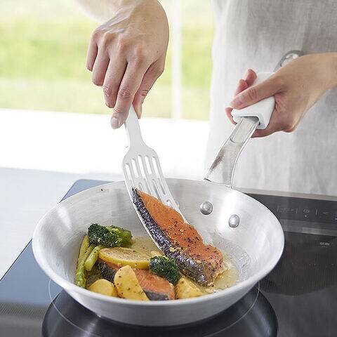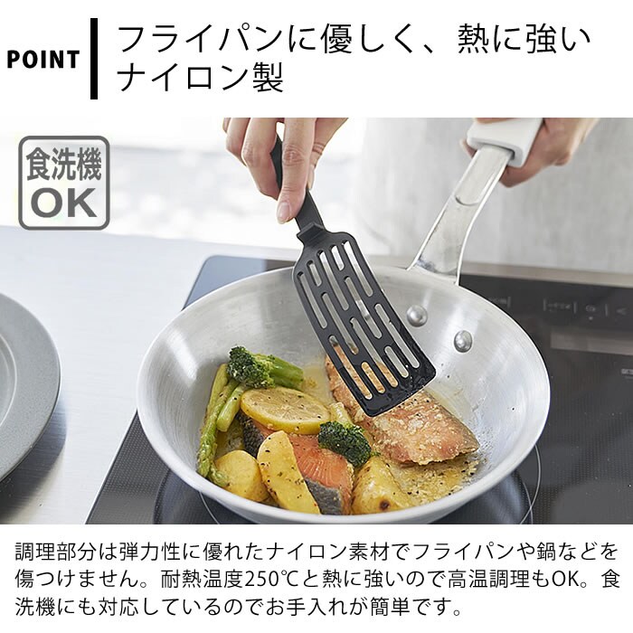 綺麗にすくえて返しやすい 長い物を乗せやすいロングサイズのターナーです。しなやかに曲がるのでフライパンと食材の間にスッと入り、長い物も形を保ったままきれいにひっくり返せます。調理部分はナイロン素材でフライパン・鍋などをキズつけません。先端が浮くので直置きにならずに清潔。食洗機に対応しています。 ![]() ![]() ![]() ![]() ![]() ![]() ![]() ![]() |